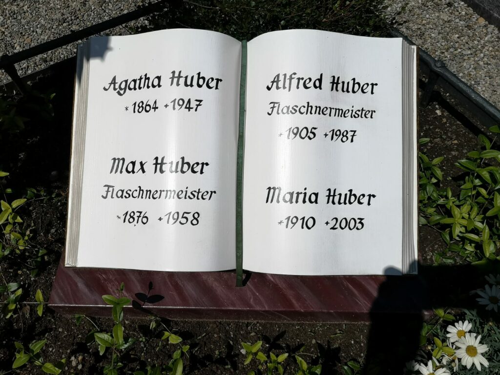 An einem der Aststümpfe hängt ein breites Schriftband mit dem Text „Ruhestätte der Familie Huber“. Neben dem Kreuz finden sich noch drei rotbraun marmorierte Sockel. Auf dem von Efeu umrankten Sockel direkt neben dem Stamm stehen ein Topf mit einer weißen Lilie und ein ovales Medaillon mit der Inschrift „Ruhet in Frieden“. Auf einem weiteren Sockel liegt ein aufgeschlagenes großes Buch, das die Namen und Lebensdaten der Verstorbenen, der Großeltern und Urgroßeltern von Wolfgang Huber, nennt. Das kleinste Podest trägt schließlich eine Schale für Weihwasser.