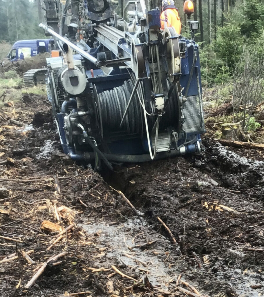 Das im Bremberger Wald in der Nähe des geplanten WKA-Standortes 3 abgesackte Bohrgerät, gesehen am 19. April. Foto: BI