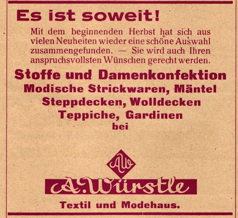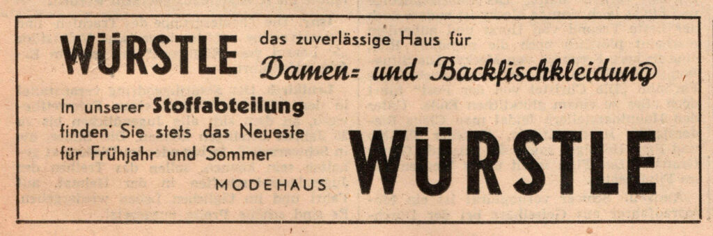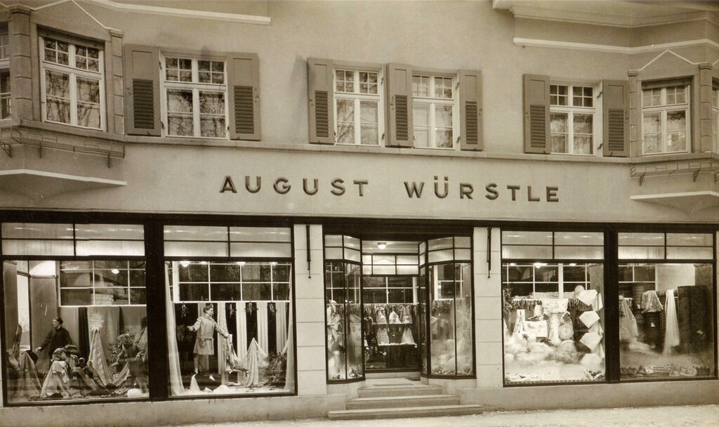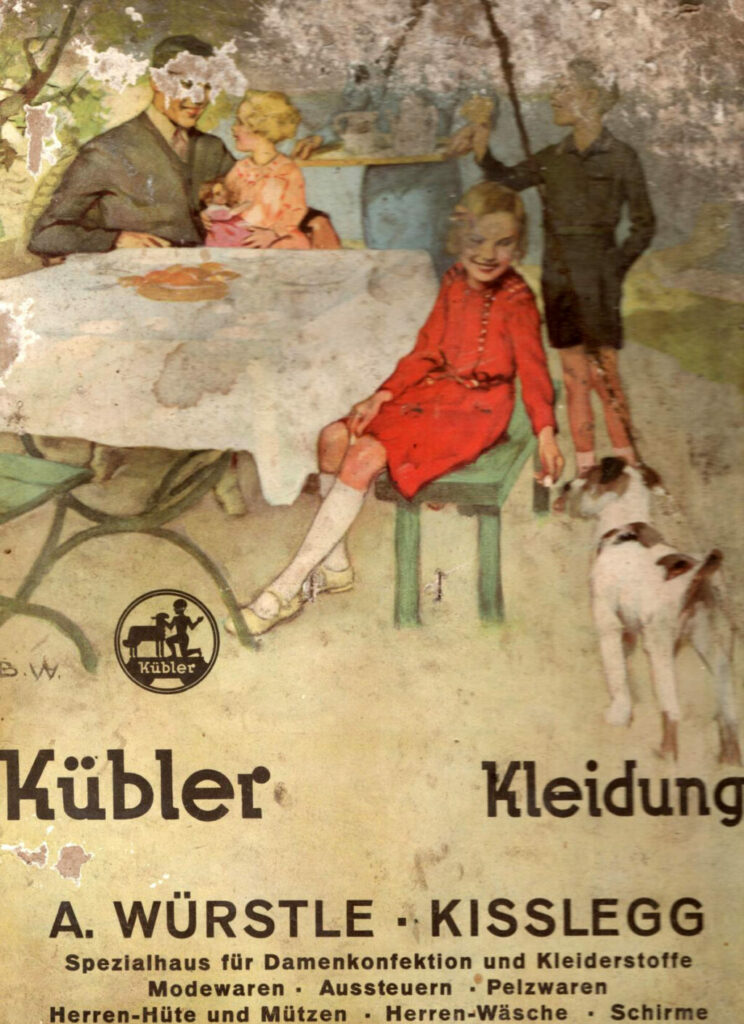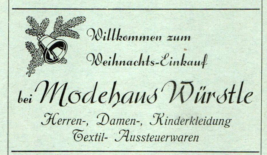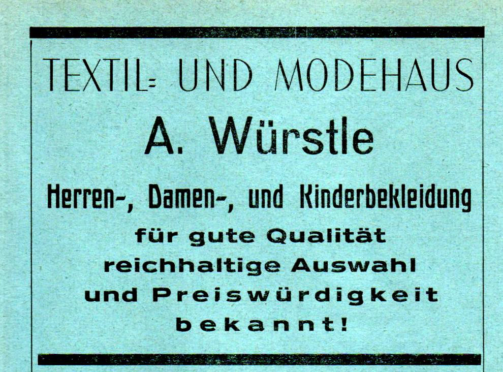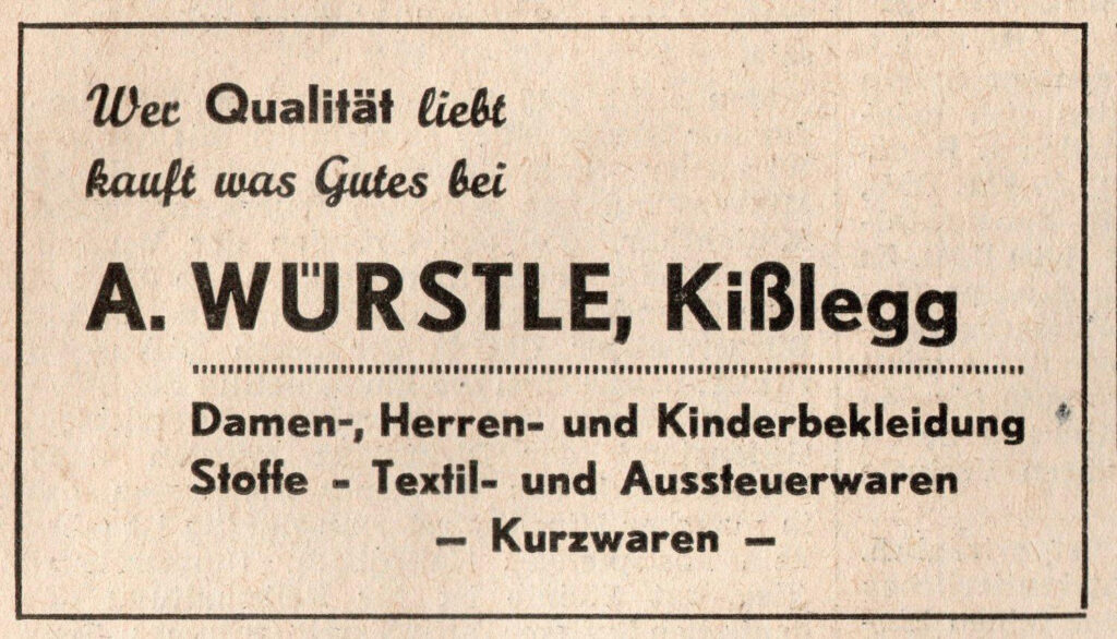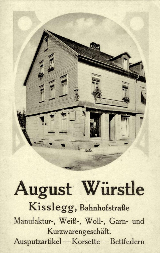 Kurz nach 1910 eröffnete der Kaufmann August Würstle ein Geschäft für Kurzwaren und Textilien in der Bahnhofstraße, direkt neben dem Heizungs- und Sanitärgeschäft Nussbaumer. Da mit den Jahren das Angebot an fertigen Textilwaren immer mehr wuchs, wurde der Platz bald zu klein und es wurde ein neues und modernes Modehaus in der gleichen Straße Richtung Ortsmitte, zwischen dem Hotel Kibele und der Landschaftsbank, errichtet. 1928 konnte man dort bereits hochwertige Kleidung von bekannten Marken wie Kübler und Bleyle (bekannt für seine Matrosenanzüge) kaufen. Vom Säugling bis zum Großvater wurde dort jeder neu eingekleidet. Ein Kleiderangebot, für das man damals in größere Städte wie Wangen, Ravensburg oder Leutkirch fahren musste, war plötzlich auch in Kißlegg zu haben.