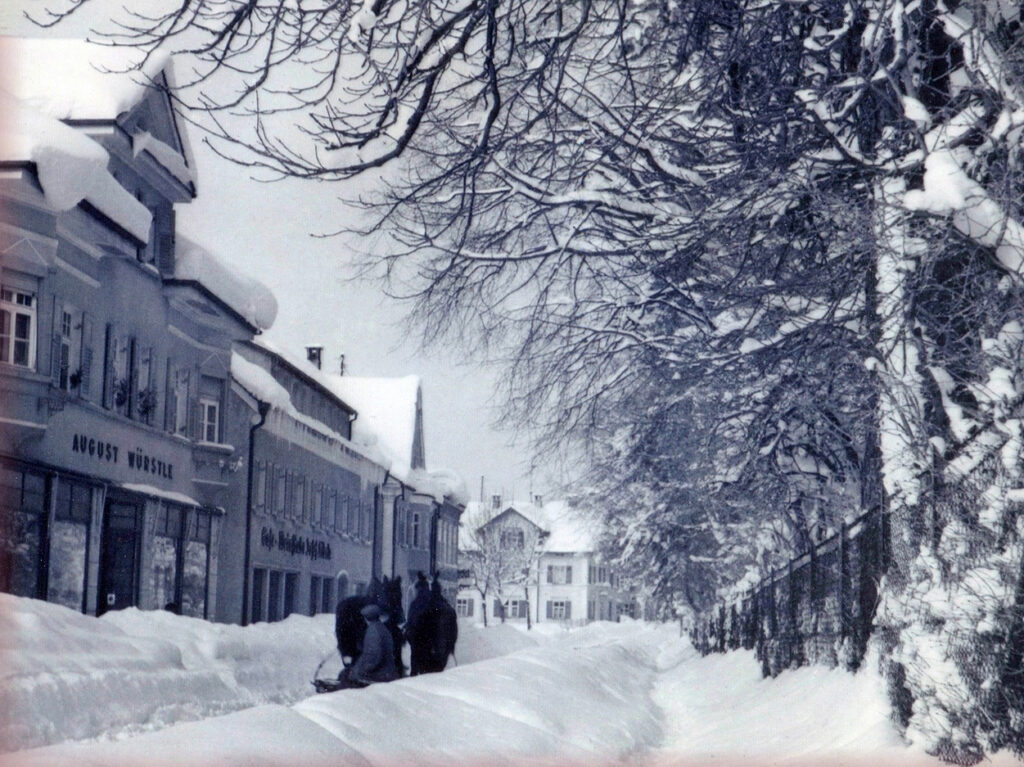 Winter 1946. Rechts neben dem Geschäft Würstle das Café und Hotel Kibele. Weiter rechts hatte Zahnarzt Lohr seine Praxis. Nach der Lücke sieht man das ehemalige Gasthaus “Traube”.