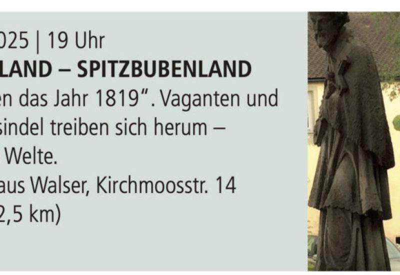„Wir schreiben das Jahr 1819″. Vaganten und allerhand Gesindel treiben sich herum – mit Anneliese Welte. Treffpunkt: Haus Walser – Kirchmoosstr. 14 (Wegstrecke 2,5 km). Preis: 7 Euro