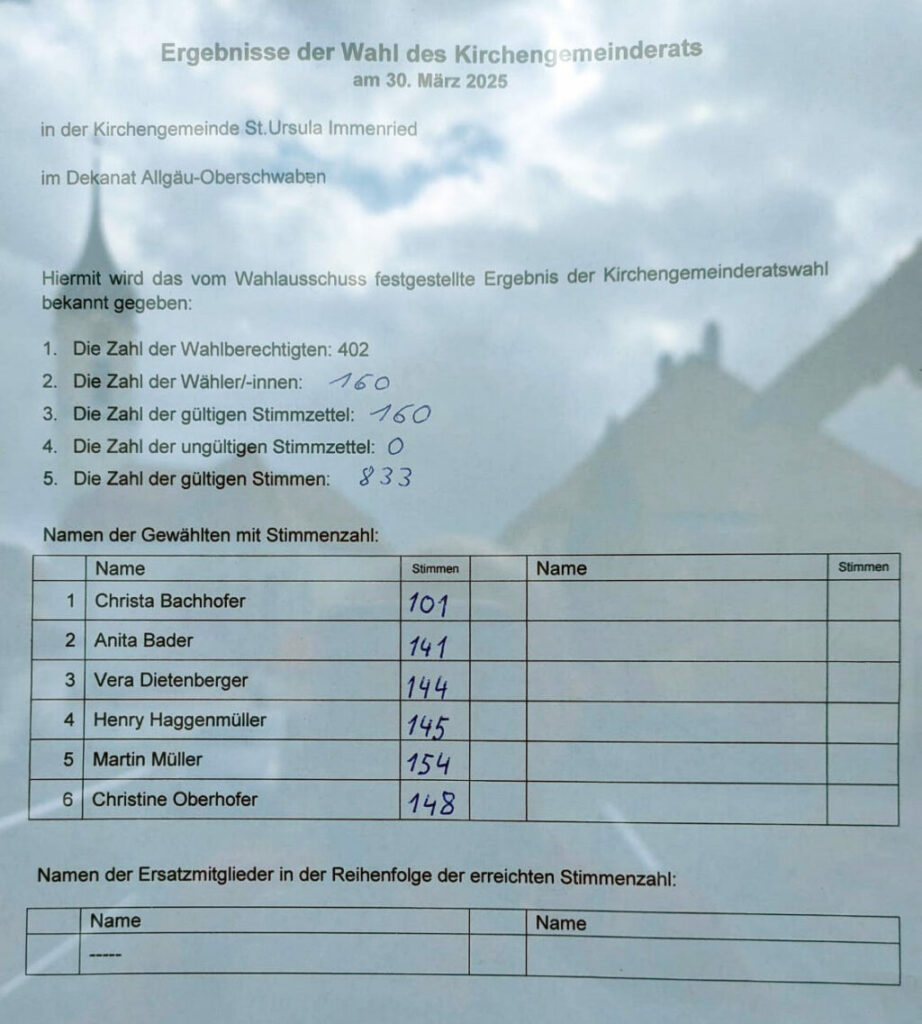 Immenried (rei) – In der katholischen Kirchengemeinde St. Ursula Immenried waren bei den Kirchengemeinderatswahlen am 30. März 402 Katholiken über 16 Jahre wahlberechtigt. Von diesen gingen 160 zur Wahl. Das ergibt eine Wahlbeteiligung von 39,8 Prozent. Von den sechs Kandidaten erreichte Martin Müller mit 154 Stimmen das beste Ergebnis. Nachstehend das Ergebnis im Einzelnen:
