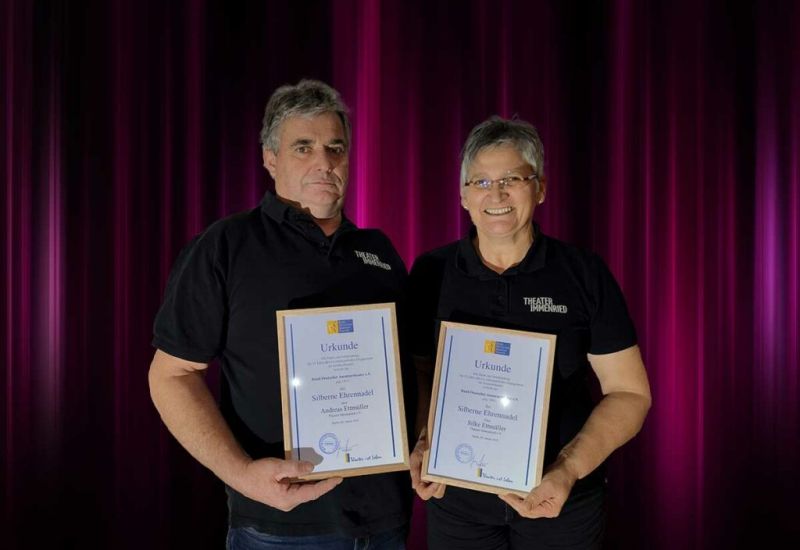 Immenried – Der Ehrenpräsident des Landesverbandes Amateurtheater Baden-Württemberg Rolf Wenhardt war bei der Dernière des Stückes „Wir sind die Neuen“ des Theater Immenried zu Gast. Nach Abmoderation und Schlussapplaus ehrte er das Ehepaar Silke und Andreas Ettmüller mit der silbernen Ehrennadel des Bundes Deutscher Amateurtheater für 25 Jahre aktives Mitwirken.