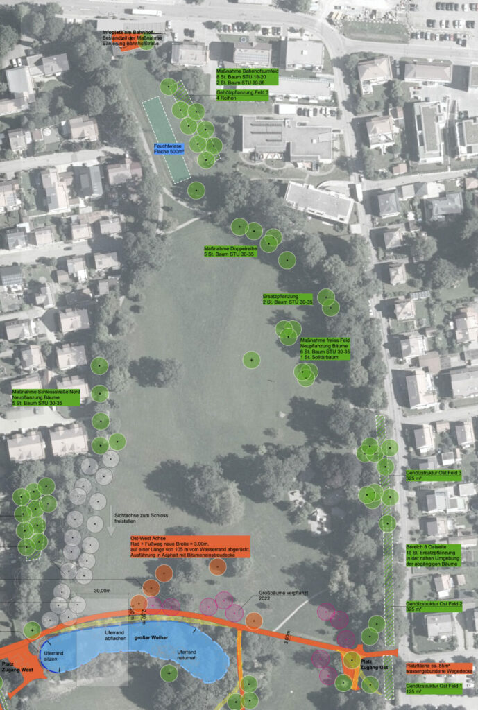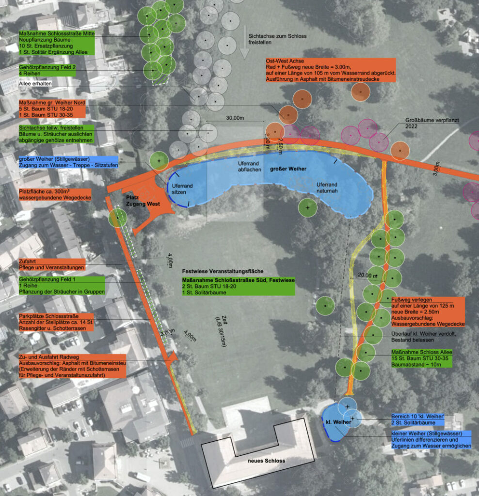 Der Gemeinderat hat am 13. September 2023 in öffentlicher Sitzung das Gesamtkonzept für den Schlosspark gebilligt und die Verwaltung beauftragt, die Maßnahmen für das Handlungsfeld 1 (Grünräume und Vegetation) öffentlich auszuschreiben. Mit der Umsetzung wird voraussichtlich am 20. November 2023 begonnen. Zuerst werden bereits abgestorbene Bäume oder Bäume mit schlechter Vitalität und geringer Lebenserwartung gefällt bzw. zurückgeschnitten. Hauptsächlich betrifft dies Eschen, welche vom Eschentriebsterben befallen sind. Anschließend werden 58 neue Bäume gepflanzt. Diese „Klimabäume“ sollen die ausgefallenen Bäume ersetzen und den Bestand im Schlosspark widerstandsfähiger gegenüber den zu erwartenden Klimaveränderungen machen. Weitere 22 Bäume folgen im kommenden Herbst. Parallel zu den Baumpflanzungen wird eine Vielzahl neuer Sträucher eingebracht, welche vor allem die Parkaußenränder ausformen und ergänzen sollen.