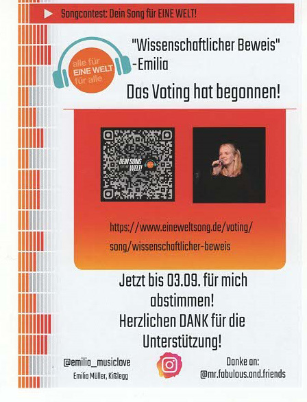 Kißlegg – Mit ihrem Song „Wissenschaftlicher Beweis“ macht Emilia Müller aus Kißlegg beim Songcontest „Dein Song für EINE WELT“ mit. Der erste Preis des User-Votings ist ein Platz auf dem „Eine-Welt-Album“. Deshalb der Aufruf, für ihren Song zu voten. Über den Link: https://www.eineweltsong.de/voting/song/wissenschaftlicher-beweis (oder über den QR-Code auf dem Flyer) kann für sie abgestimmt werden. Es geht per E-Mail UND per SMS! Man kann och bis 3. September abstimmen.