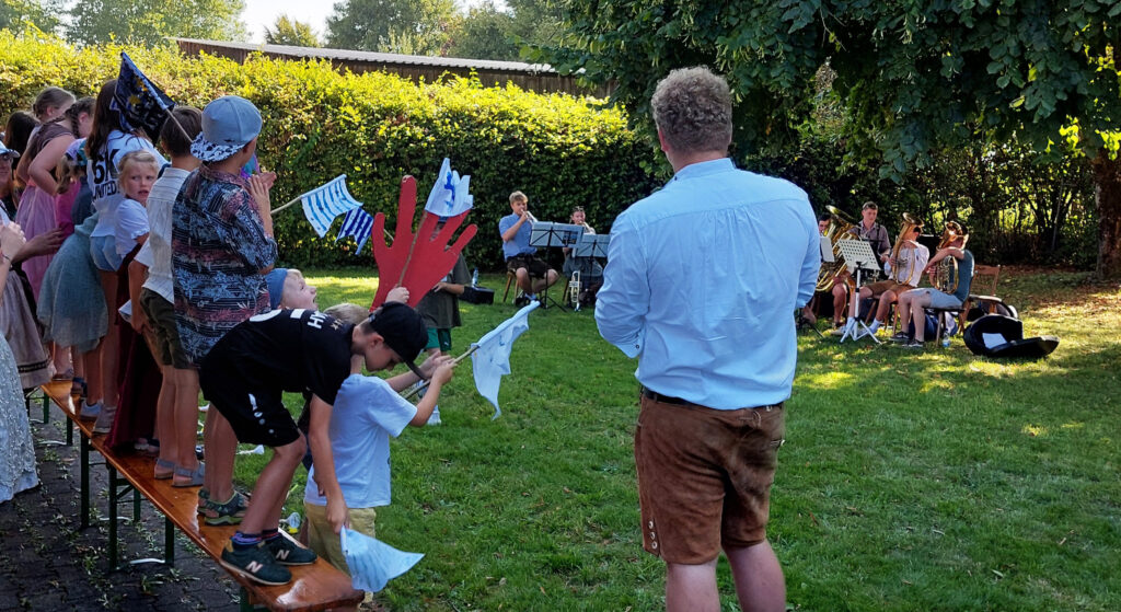 Ein feierlicher Höhepunkt des Nachmittags war der Fahneneinmarsch. Stolz präsentierten die Kinder ihre selbstgestalteten Fahnen (Bild), musikalisch begleitet von einer kleinen Besetzung des Musikvereins. Abgerundet wurde das Programm durch eine zünftige Grillwurst, was zusammen für echte Feststimmung sorgte.