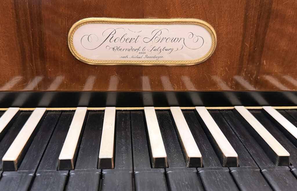 Die Tastatur des Hammerflügels mit Firmenschild des Erbauers.