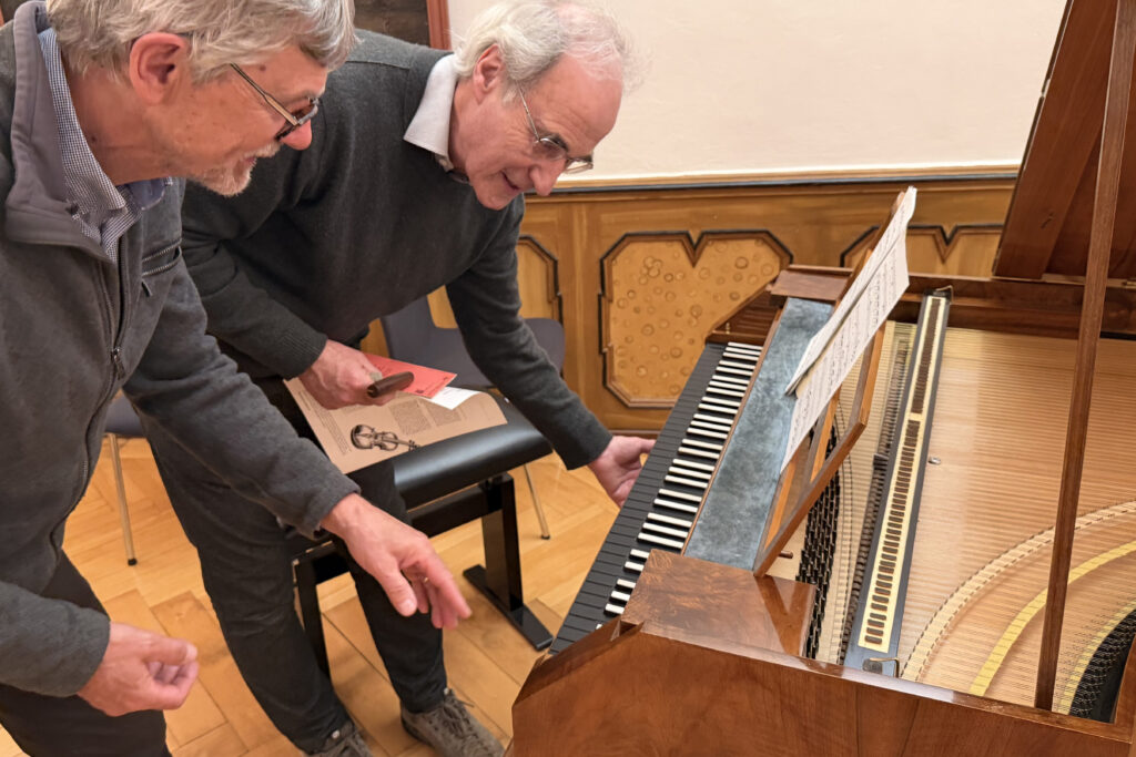 Erbauer Robert Brown (rechts) erläuterte die Besonderheiten des nachgebauten Hammerflügels.
