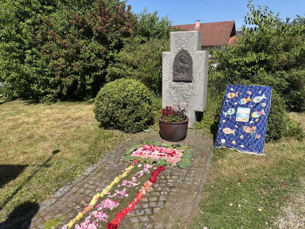 Die Prozession führte zu den liebevoll gestalteten Altären: bei der Familie Schnell, am Café Fatima, beim Pfarreiheim sowie abschließend in der Pfarrkirche. An der zweiten Station beim Café Fatima war neben dem Altar auch eine große Marienstatue Unserer Lieben Frau von Fatima aufgestellt. In besonderer Verbundenheit mit der Gottesmutter beteten Pfarrer Sohl und die versammelte Gemeinde dort auch ein „Gegrüßet seist du, Maria“. Die Altäre waren aufwendig dekoriert und mit kunstvollen Blumenteppichen geschmückt. Besonders hervorzuheben ist der Altar am Pfarreiheim, der von den diesjährigen Erstkommunionkindern gemeinsam mit ihren Familien gestaltet wurde.