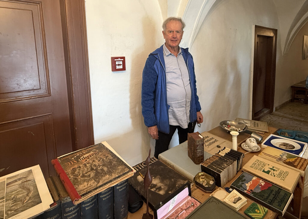 Neben dem Kinderflohmarkt auf der Wiese vor der Hüpfburg, wo ausgemusterte Kleidung, Spielzeug und weitere Gebrauchtgegenstände neue Besitzer finden konnten, gab es auch einen Markt im Inneren des Hauptgebäudes, in dem sich auch das Heimatcafé befindet. Für Geschichtsinteressierte und Antiquitätenliebhaber waren viele dieser Stände genau das Richtige. Neben antiquarischen Büchern und Kunstwerken gab es auch zahlreiche Anstecknadeln in verschiedenen Preisklassen. Diese unscheinbaren Nadeln haben teilweise eine interessante Vergangenheit: Manche von ihnen wurden von Jägern, andere von Mitgliedern verschiedener Vereine getragen, andere von Soldaten.