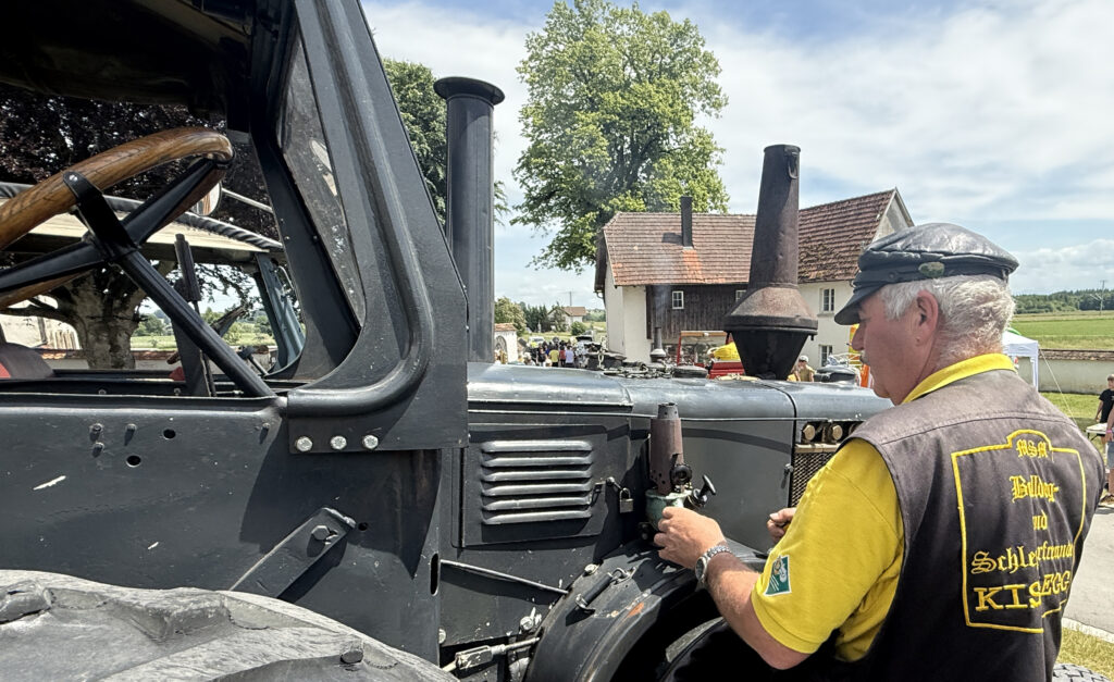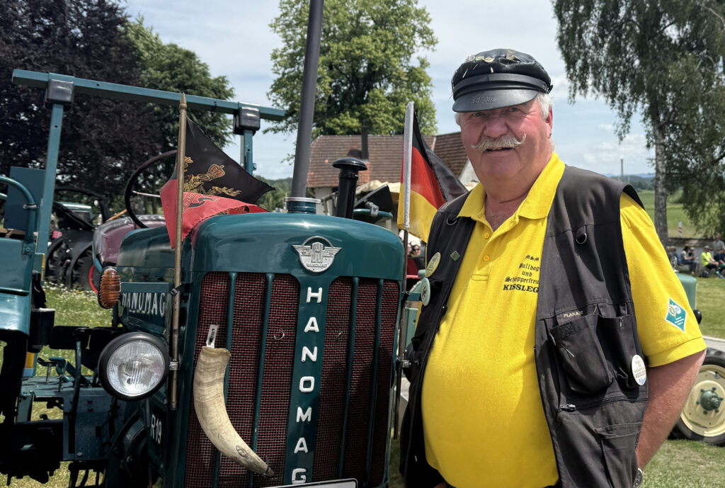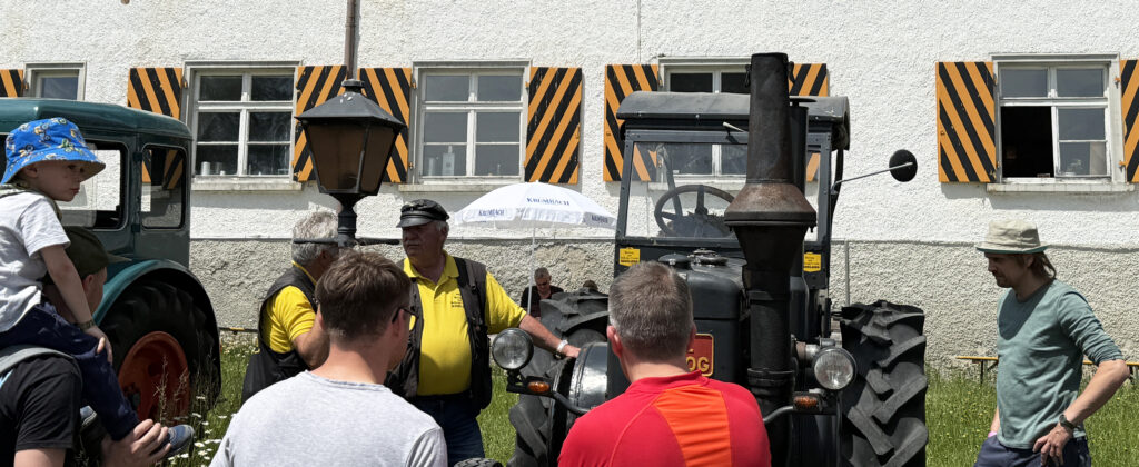 Hubert Kling von den Bulldog- und Schlepperfreunden Kißlegg erklärt einen Bulldog von Lanz-Mannheim.