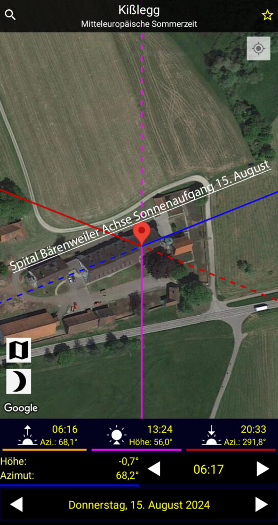 Die Achse des Hauptgebäudes mit angeschlossener Kirche weist zum Sonnenaufgang am 15. August. Das hat Heimatpfleger Stephan Wiltsche herausgefunden. Am 15. August feiert die katholische Kirche Mariä Himmelfahrt. Das Hochaltarbild in der Kirche in Bärenweiler zeigt die Krönung Mariens. Ein zweites Lichtphänomen: In den Tagen um Mariä Lichtmess (2. Februar) fällt der Lichtstrahl der Abendsonne genau auf den Altar (nachstehendes Bild). Grafik oben: Stephan Wiltsche; nachstehendes Foto: Stephan Wiltsche