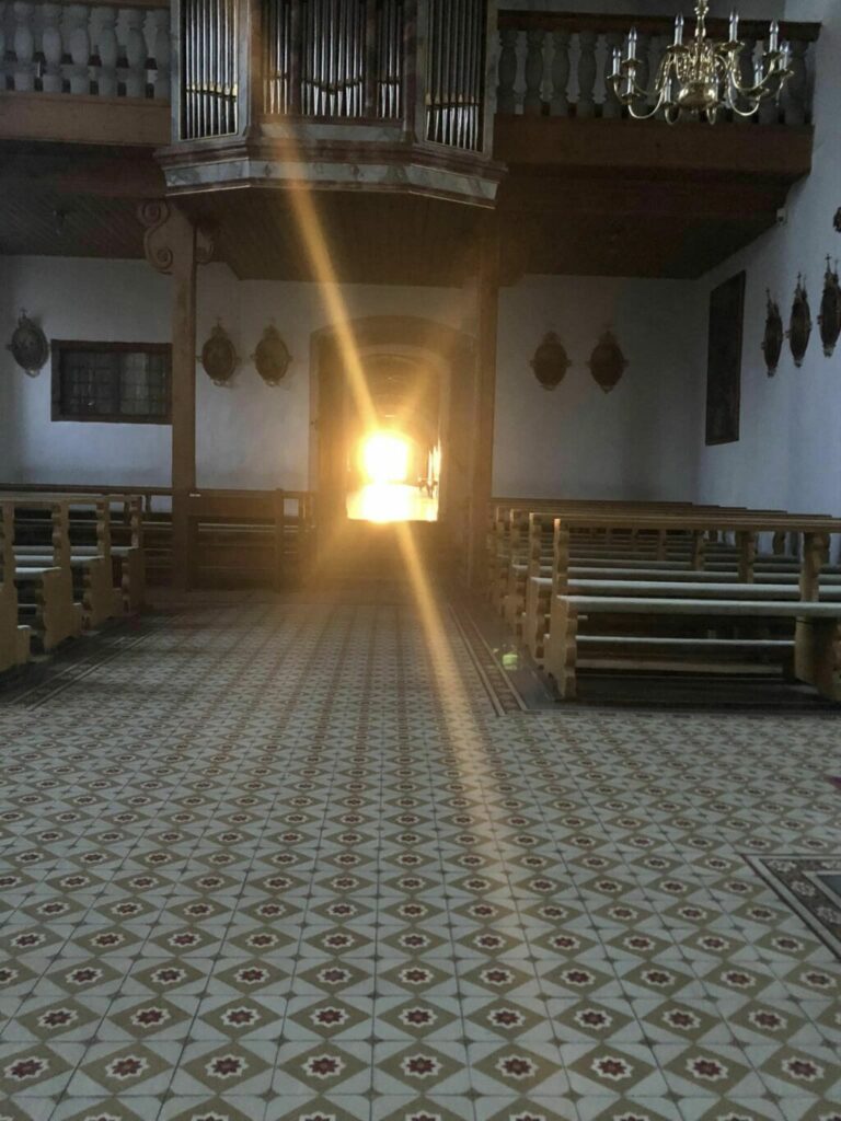 Lichteinfall durch die gesamte Gebäudeachse (Kirche plus Spitalhauptgebäude) – fotografiert von Stephan Wiltsche am 2. Februar 2024 (Mariä Lichtmess). Der Strahl der Abendsonne zielt genau auf den Hochaltar mit dem Bild der Krönung Mariens.