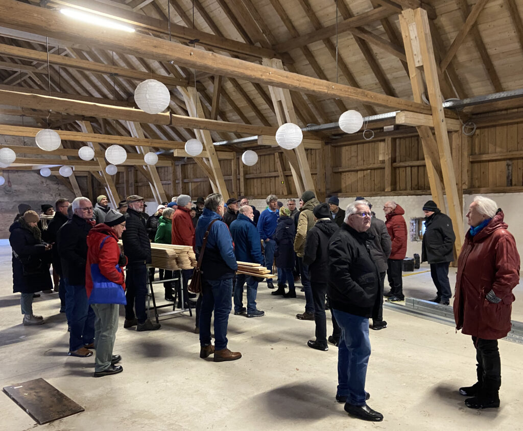 Mitglieder der Arbeitsgemeinschaft Heimatpflege Württembergisches Allgäu in der großen Scheune in Bärenweiler. Foto: Hans Knöpfler