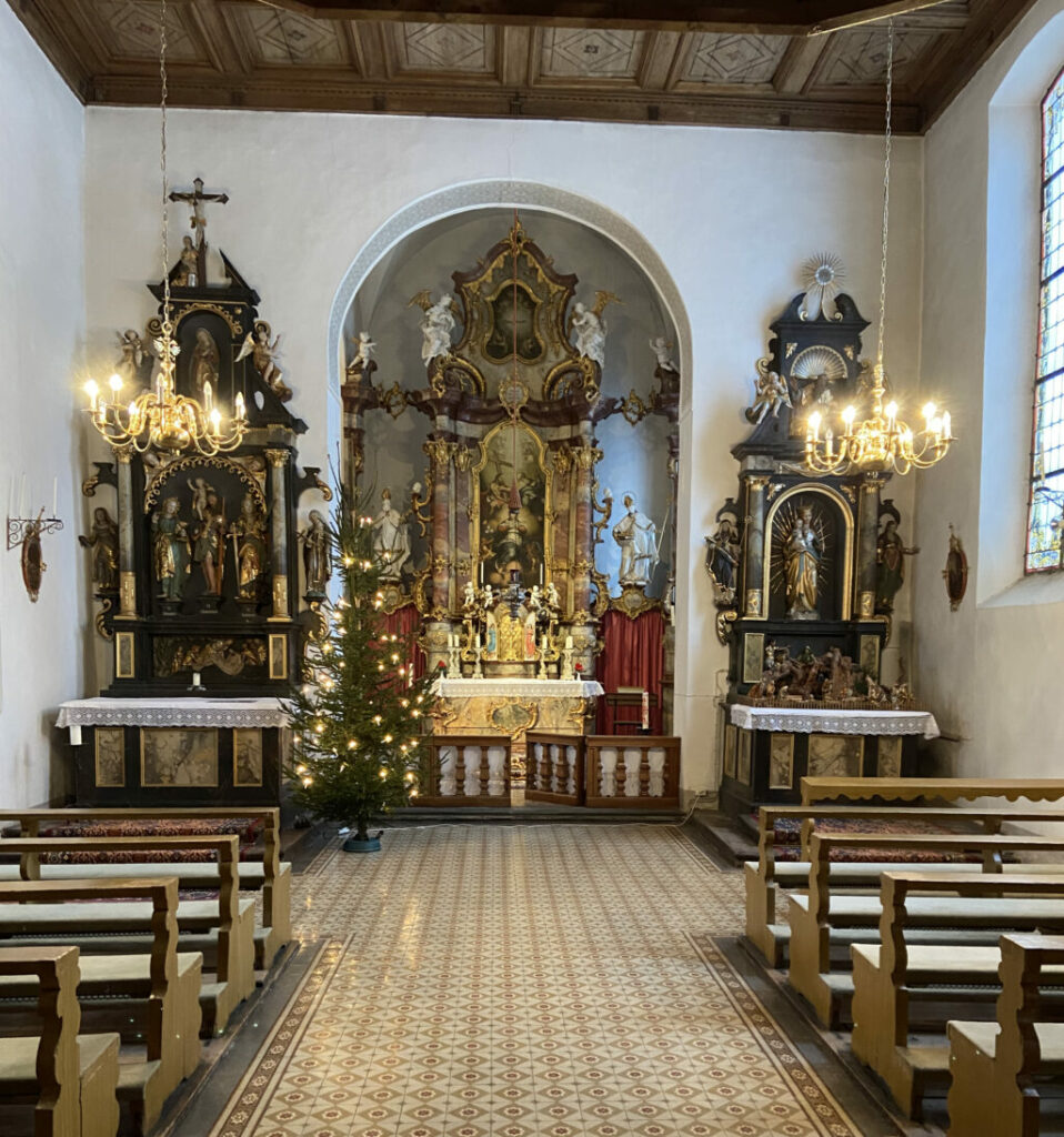 Künstlerisch eindrucksvoll ist besonders die frühbarocke Kapelle. Mit einem Kurzvortrag zeigte der Vereinsvorsitzende Stephan Wiltsche, dass diese Kapelle (so wie auch viele andere Kirchen) nach alter Sitte nach Osten ausgerichtet ist und dass sie am 15. August 1619 (an Mariä Himmelfahrt) eingemessen wurde, vermutlich durch den damals bekannten Wangener Landvermesser J.A. Rauch. Interessanterweise trifft der Sonnenstrahl am 2.2. (Mariä Lichtmess!) den Gang des Kirchenschiffs entlang direkt auf den Altar.