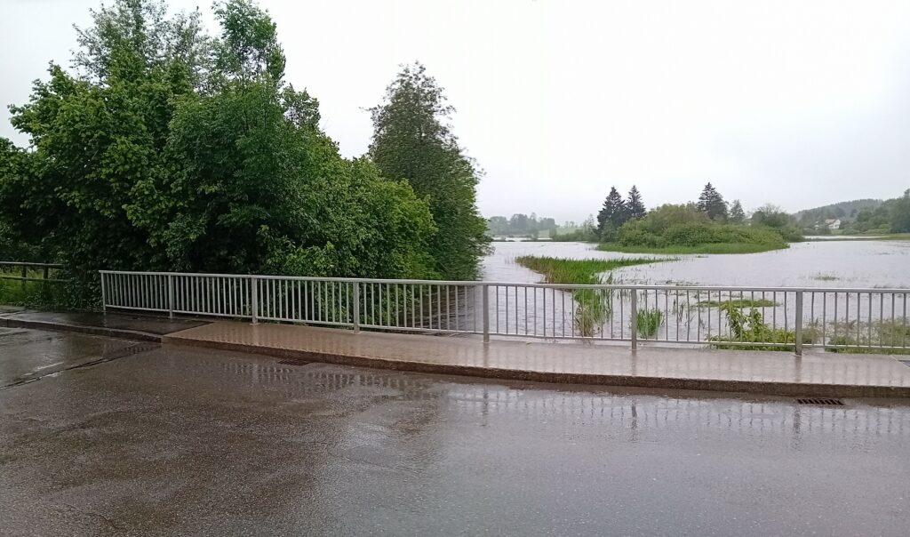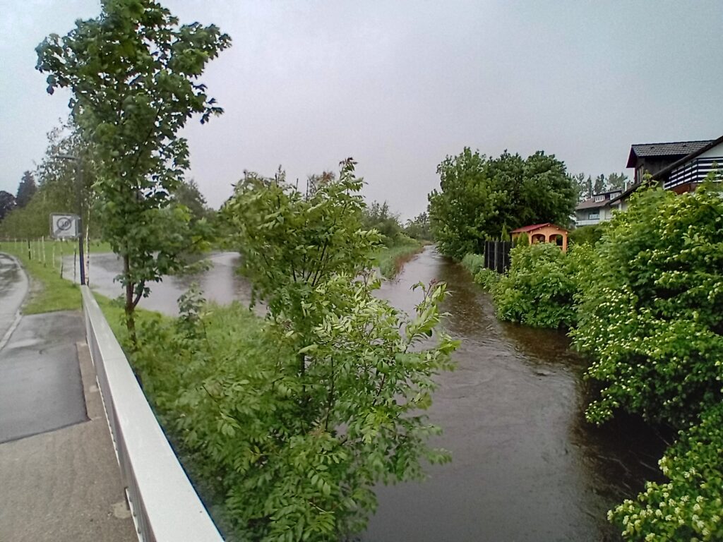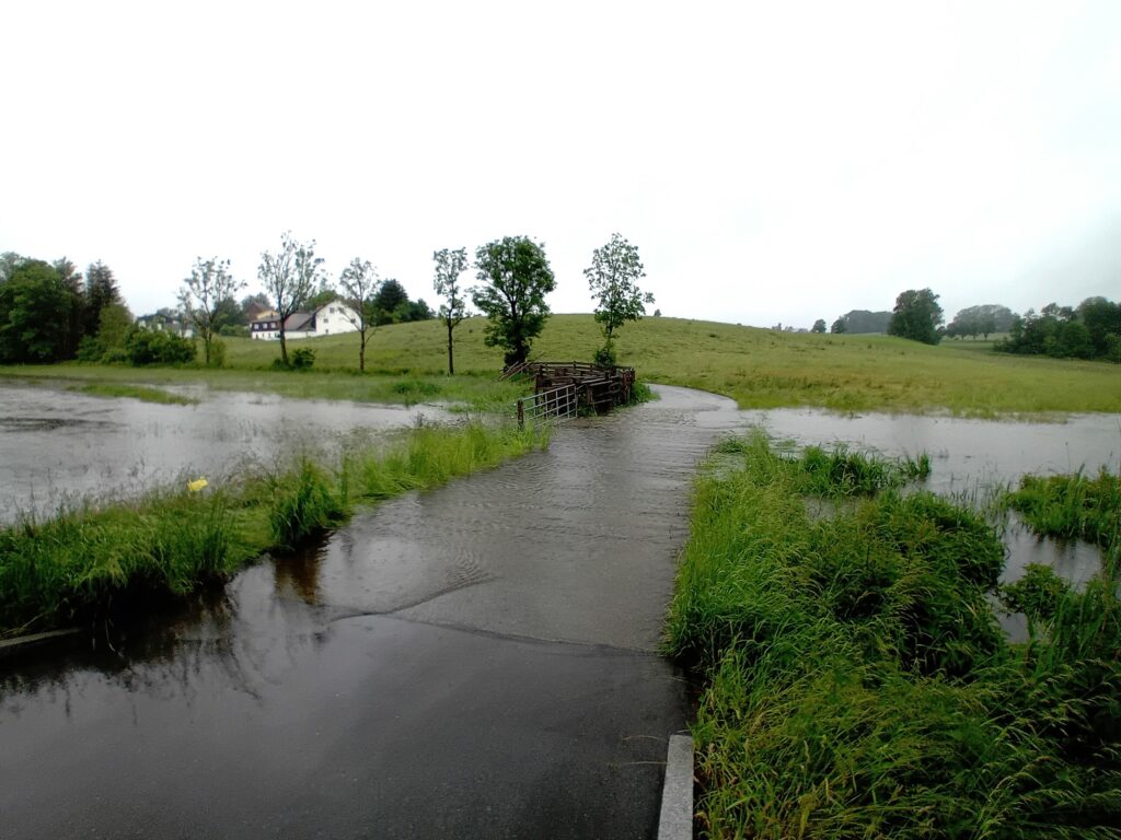 Wolfegger Ach unterhalb von Rempertshofen, überschwemmte Straße an der Achbrücke am 1. Juni.