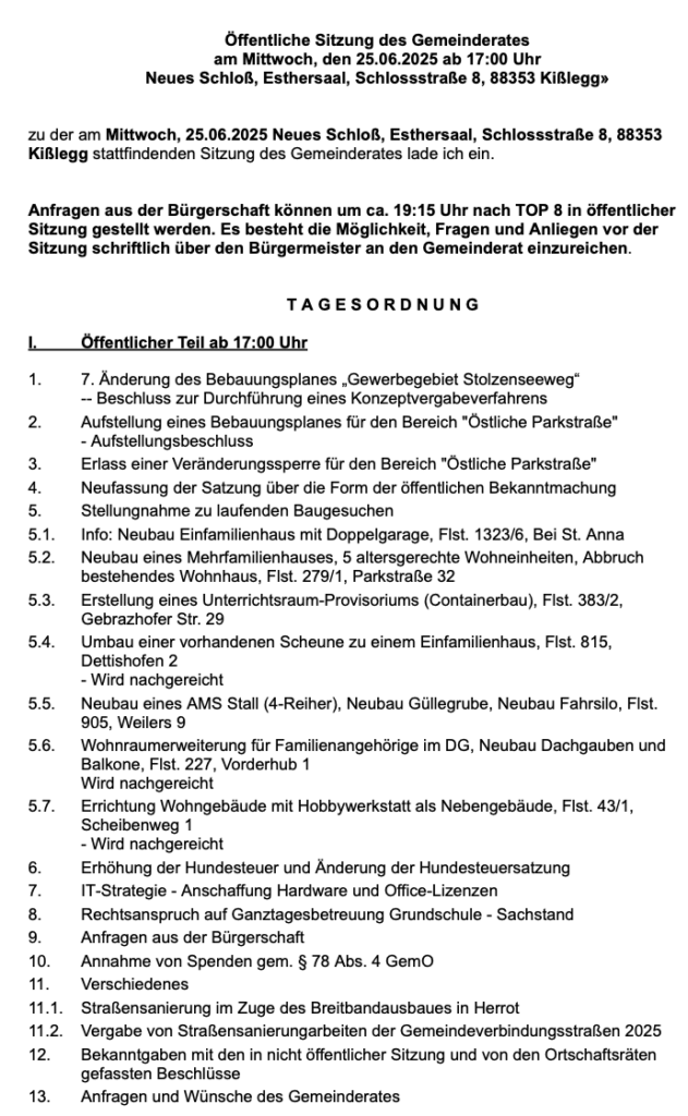 Kißlegg – Der Gemeinderat versammelt sich am 25. Juni um 17.00 Uhr in öffentlicher Sitzung im Neuen Schloß (Esthersaal). Anfragen aus der Bürgerschaft können um ca. 19.15 Uhr nach TOP 8 in öffentlicher Sitzung gestellt werden. Es besteht die Möglichkeit, Fragen und Anliegen vor der Sitzung schriftlich über den Bürgermeister an den Gemeinderat einzureichen. Auf der Tagesordnung stehen folgende 13 Punkte: