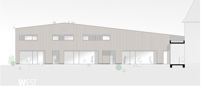 So wird der Anbau des Kindergartens St. Hedwig aussehen (Ansicht von Westen). Bauamtsleiter Manfred Rommel zeigte diese Zeichnung am Mittwochabend dem Kißlegger Gemeinderat. 2026 soll gebaut werden.
