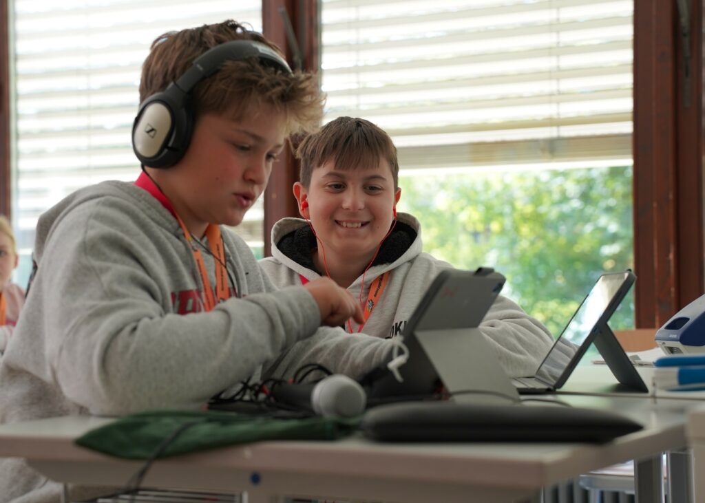 Schüler bei der Musikproduktion im Workshop „Wertschätzend Rappen“.