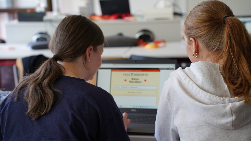 Schülerinnen recherchieren zum Thema Fake News im Workshop „Umgang mit Fake News – Faktencheck kreativ.