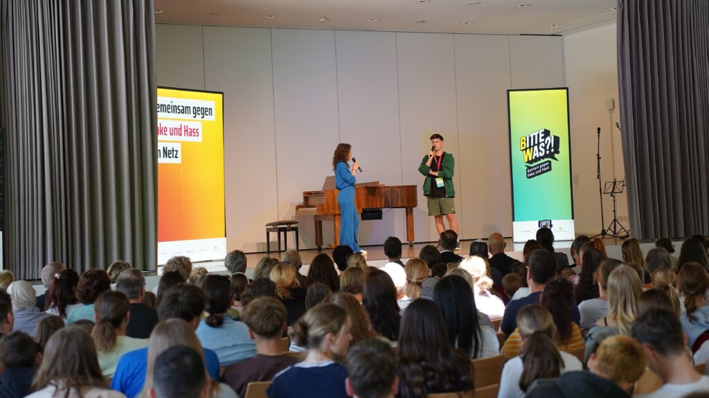 Neben den Themen Hass und Hetze haben sich die Schüler in einem Workshop auch mit Fake News beschäftigt. Um zu verdeutlichen, wie schwer es ist, diese zu erkennen, präsentierten sie dem Publikum zwei verschiedene Nachrichten. Als sie erklärten, dass eine dieser Nachrichten gefälscht sei, war das Publikum von der Echtheit des Fake verblüfft. Wie die Schüler erklären, ist es sehr wichtig, die Quellen und Fakten zu überprüfen, um Falschnachrichten zu erkennen. Neben Fake News sind Deepfakes eine weitere gängige Masche, um Desinformationen zu verbreiten. Deepfakes sind bearbeitete oder mit künstlicher Intelligenz erstellte Bilder oder Videos von Personen. Diese erkennt man bei genauerem Hinsehen häufig an kleinen optischen Fehlern.