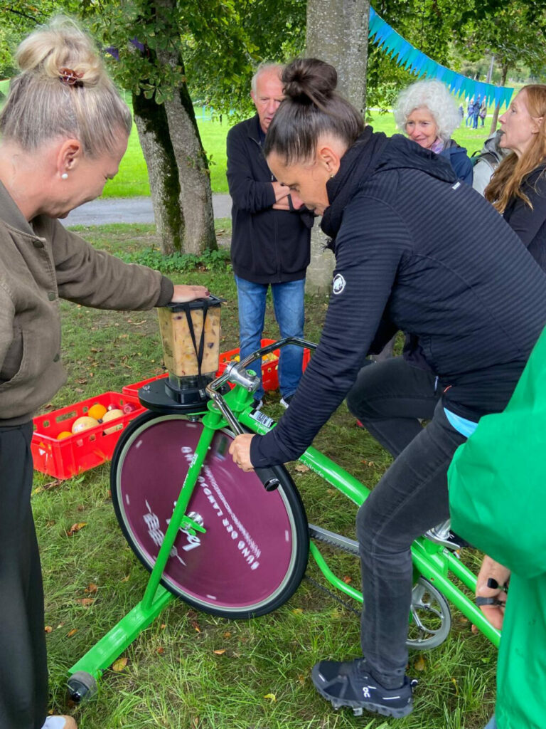 Die Frauen von „Fairteiler” boten die Möglichkeit, mit eigener Bein-Muskelkraft einen Smoothie aus abgelaufenen, aber verwendbaren Lebensmitteln zu mixen.