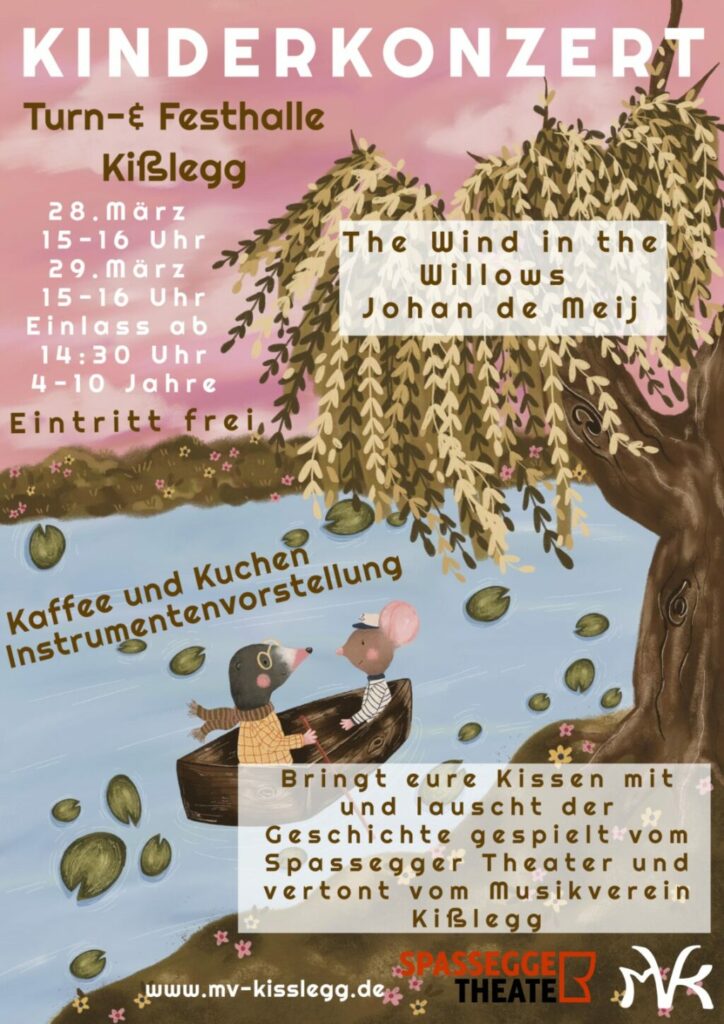 Im Mittelpunkt steht das Werk „The Wind in the Willows“ von Johan de Meij, basierend auf der berühmten Kindergeschichte von Kenneth Grahame. In vier abwechslungsreichen Sätzen vertonte de Meij die rührende Geschichte rund um Ratte, Maulwurf und Kröte. Am Hauptschauplatz, dem Fluss, geraten die drei Freunde in spannende, lustige und berührende Abenteuer. Mal träumerisch und sanft, mal lebhaft und voller Schwung, die Musik nimmt kleine und große Zuhörerinnen und Zuhörer mit auf eine fantasievolle Reise ans Wasser.