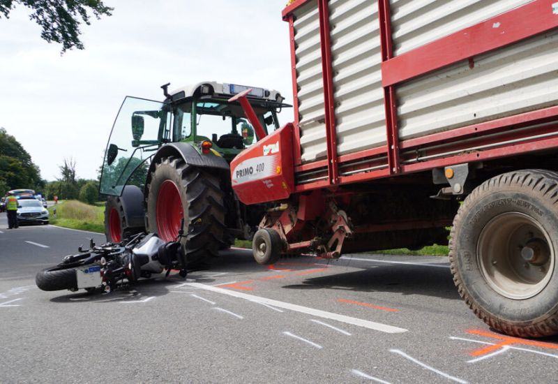 Leupolz – Ein 39 Jahre alter Motorradfahrer ist am Sonntagmorgen (7.9.) um ca. 10.40 Uhr bei einem Verkehrsunfall zwischen Praßberg und Beutelsau ums Leben gekommen. Nach Polizeiangaben war der Mann auf der Kreisstraße K8007, von Allewinden kommend, in Richtung Beutelsau unterwegs gewesen, als er zum Überholen eines Wohnmobils und eines Traktors ansetzte. Dabei geriet er auf den linken Grünstreifen, verlor die Kontrolle über sein Motorrad und prallte gegen den Anhänger des Traktors. De…