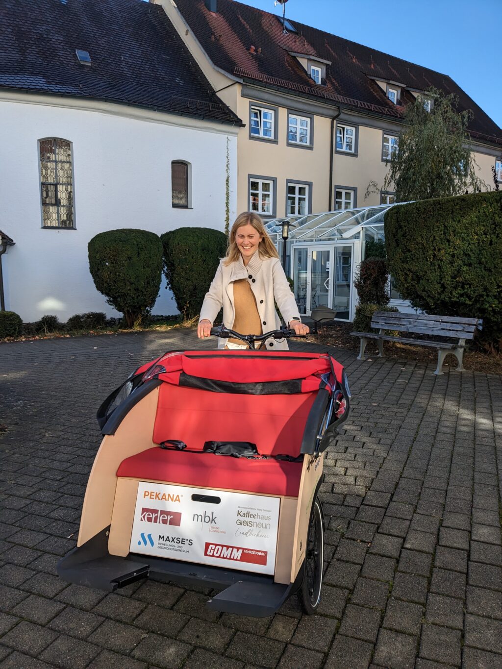 Die Leiterin des Ulrichsparks, Beatrice Winter, nahm die E-Rikscha mit Freuden entgegen und bedankte sich bei der Bürgerstiftung und bei allen Sponsoren für diesen zukünftigen Blickfang in Kißlegg. Das Fahrrad sei ein großer Zugewinn für die Einrichtung, das von möglichst vielen Klienten genutzt werden wird. Finanziell unterstützt wurde die Anschaffung des Fahrzeugs von diesen Unternehmen: GLW GmbH, Gomm Fahrzeugbau GmbH, Hans Rinninger u. Sohn GmbH & Co. KG, Kaffeehaus Gleisneun, Kerler GmbH, Maxse’s Bewegungs- und Gesundheitszentrum, mbk Maschinenbau GmbH, PEKANA Naturheilmittel GmbH, Stengele Holz und Kunststofftechnik GmbH, Thüga Energie GmbH.
