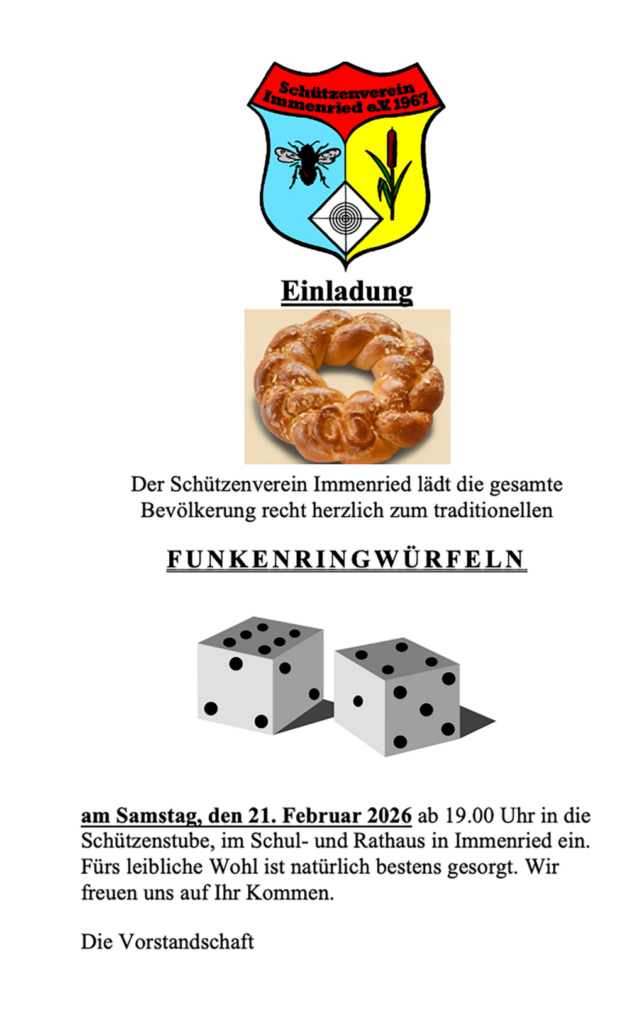 Immenried – Der Schützenverein Immenried lädt die gesamte Bevölkerung recht herzlich zum traditionellen Funkenringwürfeln am Samstag, 21. Februar, ab 19.00 Uhr in die Schützenstube (im Schul- und Rathaus) in Immenried ein. Fürs leibliche Wohl ist natürlich bestens gesorgt. Wir freuen uns auf Ihr Kommen.