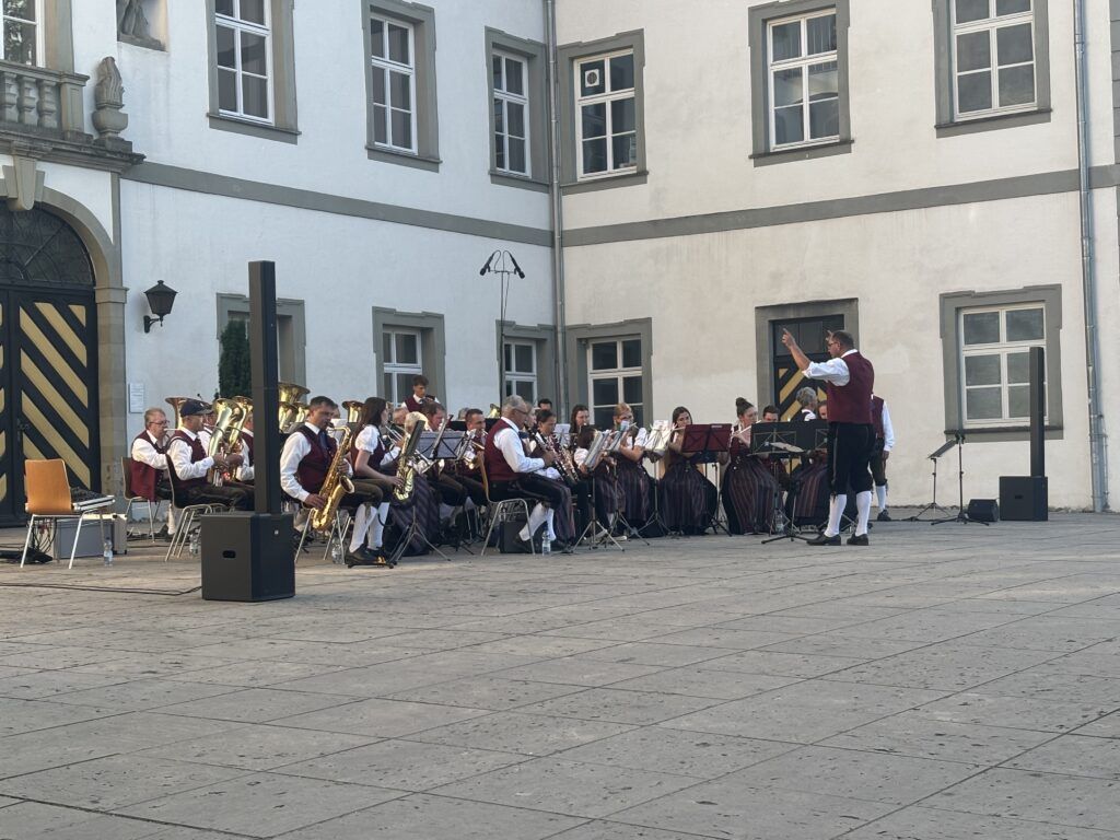 Kisslegg – Im Rahmen der Sommerabendkonzerte der Gemeinde Kisslegg unterhielt der Musikverein Immenried am Dienstagabend, 24. Juni, vor dem Neuen Schloss die zahlreichen Zuhörer. Prächtiger Sonnenschein bot eine tolle Kulisse für eine gute Stunde Blasmusik.