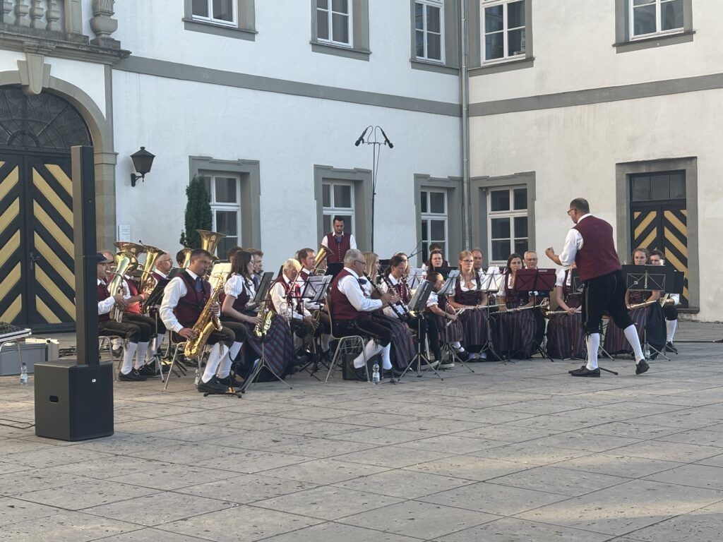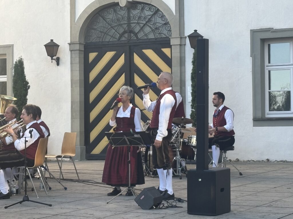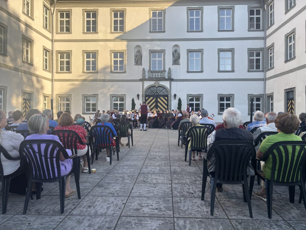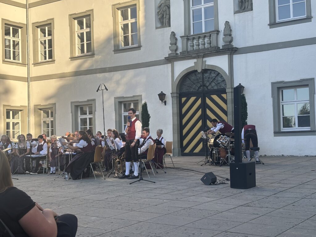 Kisslegg – Im Rahmen der Sommerabendkonzerte der Gemeinde Kisslegg unterhielt der Musikverein Immenried am Dienstagabend, 24. Juni, vor dem Neuen Schloss die zahlreichen Zuhörer. Prächtiger Sonnenschein bot eine tolle Kulisse für eine gute Stunde Blasmusik.