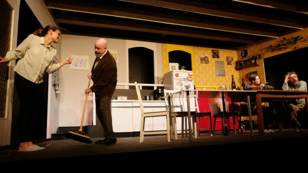 Wie schon beim letzten Stück ist die Bühne zweigeteilt: links die Wohnung der Jungen, rechts die der „Neuen“. Oft stehen alle Schauspieler gleichzeitig auf der Bühne. Während die eine Seite spricht, muss die andere Seite sich pantomimisch betätigen, ein Kunstgriff von Regisseur Sandro Droth, der sehr hohe Ansprüche an die schauspielerische Leistung der Einzelnen stellt.