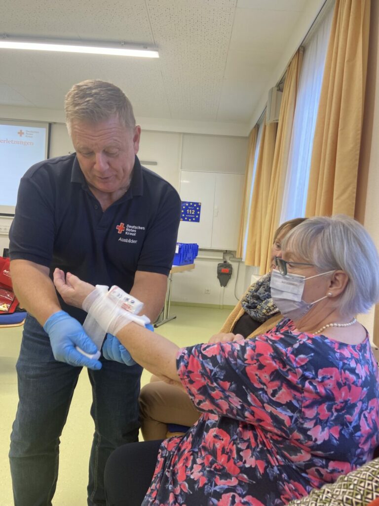 Ausbildungsleiter Jörg Rusch vom DRK- Kreisverband Wangen vermittelte in drei Stunden zahlreiche wichtige und grundlegende Themen sehr anschaulich und praxisorientiert. Die Teilnehmenden zeigten sich sehr interessiert. Jörg Rusch gelang es durch und mit sehr vielen Beispielen aus seiner langjährigen Praxis im Rettungsdienst mit dem sehr anschaulichen und lebendig aufbereiteten Vortrag das Interesse über drei Stunden aufrechtzuerhalten.