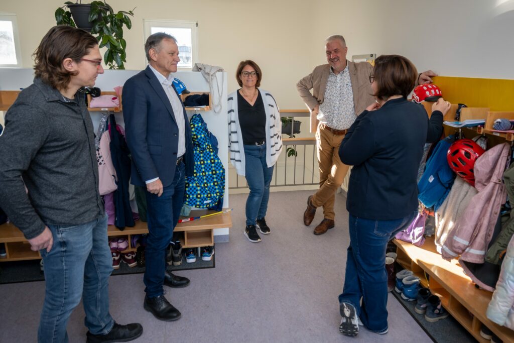 Leutkirch – Bei einem Vor-Ort-Termin informierten sich kürzlich Oberbürgermeister Hans-Jörg Henle, Max Eff vom Fachbereich Hochbau der Stadt Leutkirch, Einrichtungsleiterin Stefanie Vergens, stellvertretende Leiterin Silke Schmidt sowie Jörg Thomas Kuon vom Träger, dem Deutschen Roten Kreuz, über den erfolgreichen Abschluss der Sanierungsarbeiten am Kindergarten Firlefanz.