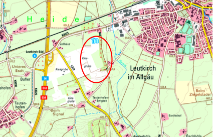 Das Gewerbegebiet Heidrain 2 (rot eingekringelt) liegt südlich der Wangener Straße in einer ehemaligen Kiesgrube. Die Karte wurde den Sitzungsunterlagen entnommen.