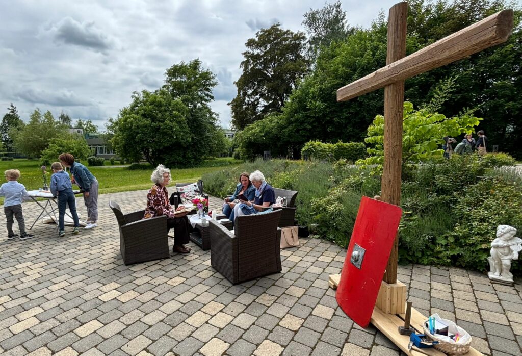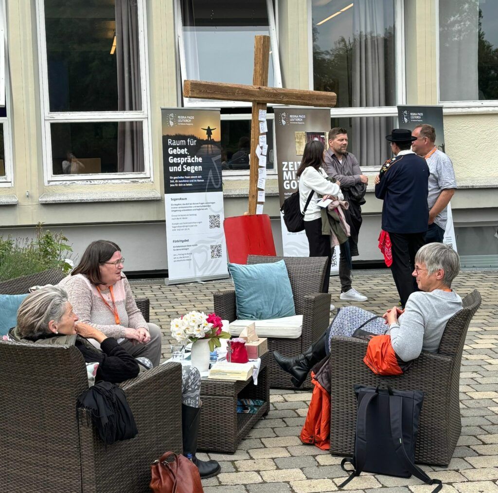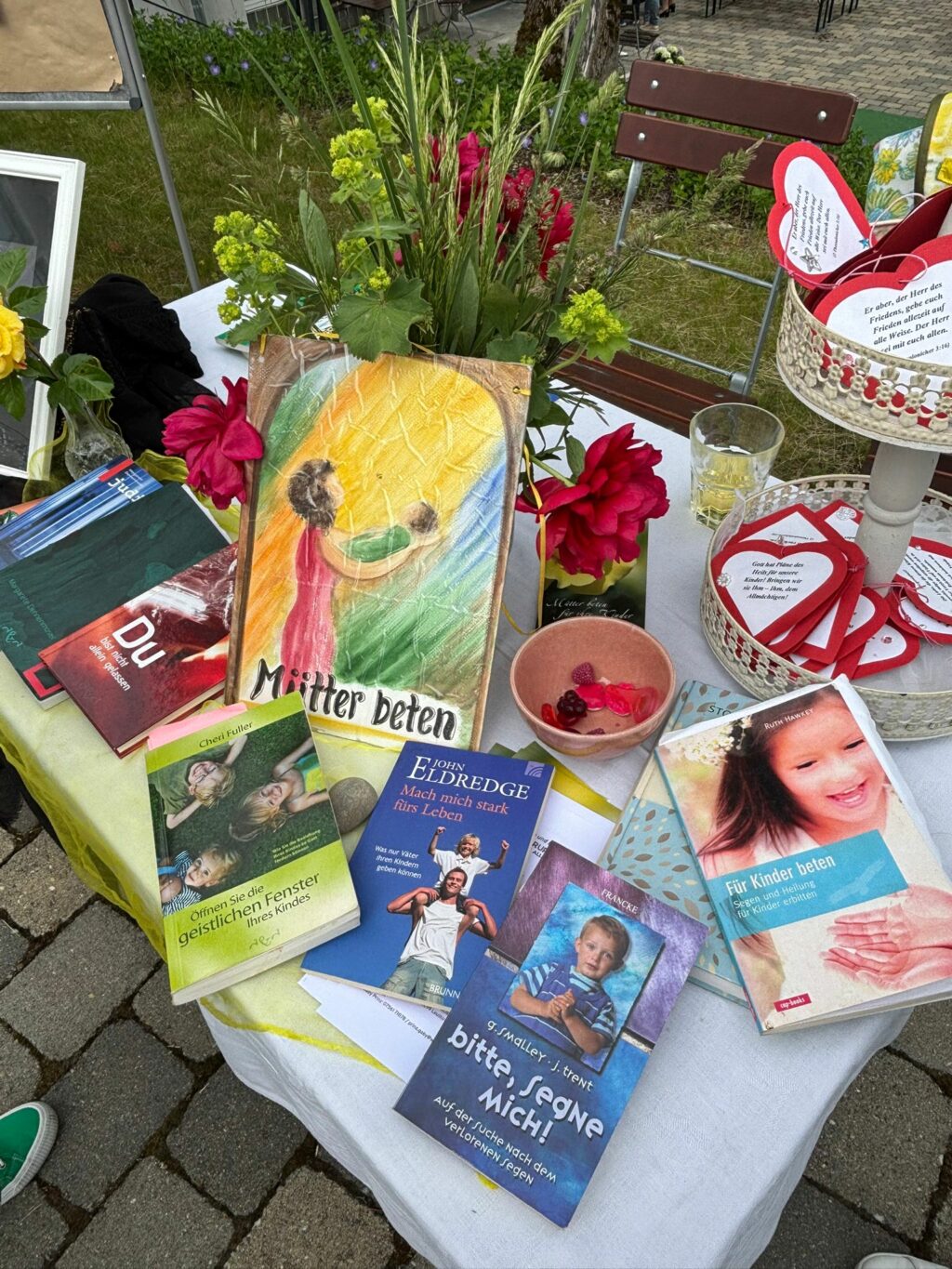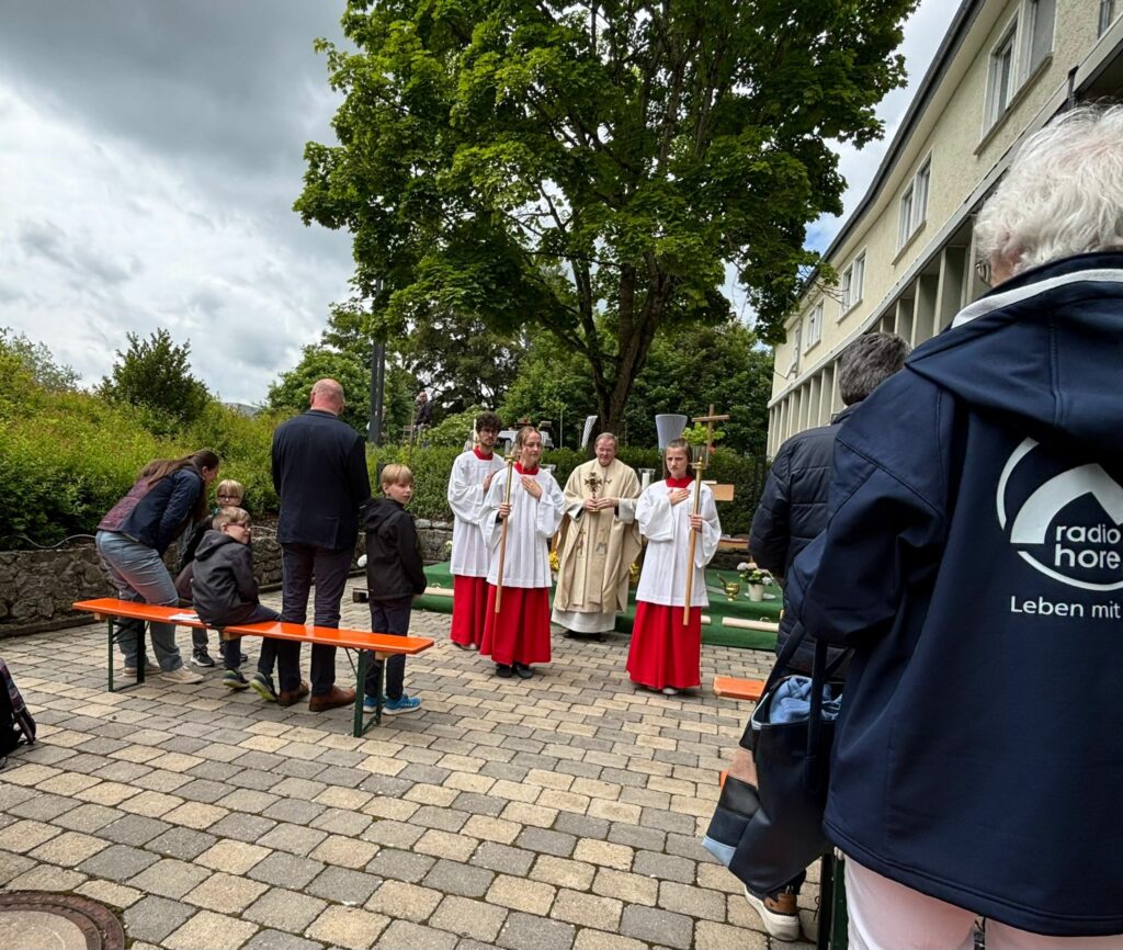 Nach der Hl. Messe war eine kleine Bitt-Prozession zur Kapelle, wo auch der Segen erteilt wurde. Danach gab es ein leckeres (auch vegetarisches) Mittagessen, später Kaffee und Kuchen. Bei den kulinarischen Köstlichkeiten verweilten viele an diesem sonnigen Nachmittag, es gab gute Gespräche, manche lernten sich kennen, die sich bisher nur von weitem oder in der Kapelle gesehen hatten. Ansprechend waren die Info-Stände gestaltet, wo „Zeit mit Gott“, Zeit mit Menschen verbracht werden konnte. Die Zellgruppe und die Mütter-beten-Gruppe luden ein, es gab gebastelte Herzen, und an einem Holzkreuz konnte man seine Sorgen mit Zettel hinnageln. Danach gab es mit Berührung des Kreuzes einen guten Rat oder Impuls zu seinen privaten Themen und Anliegen.