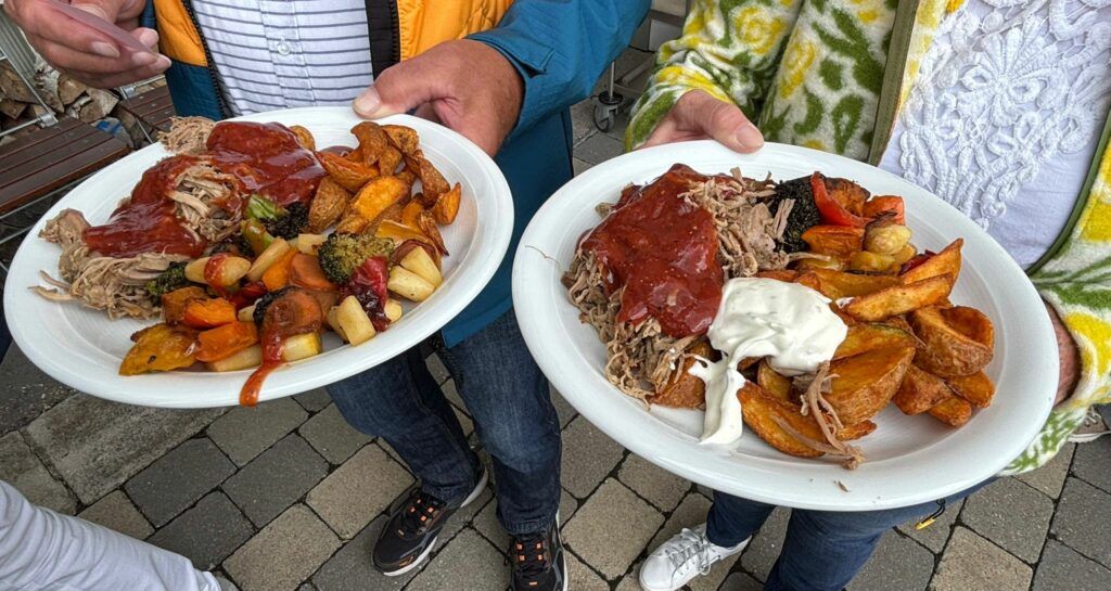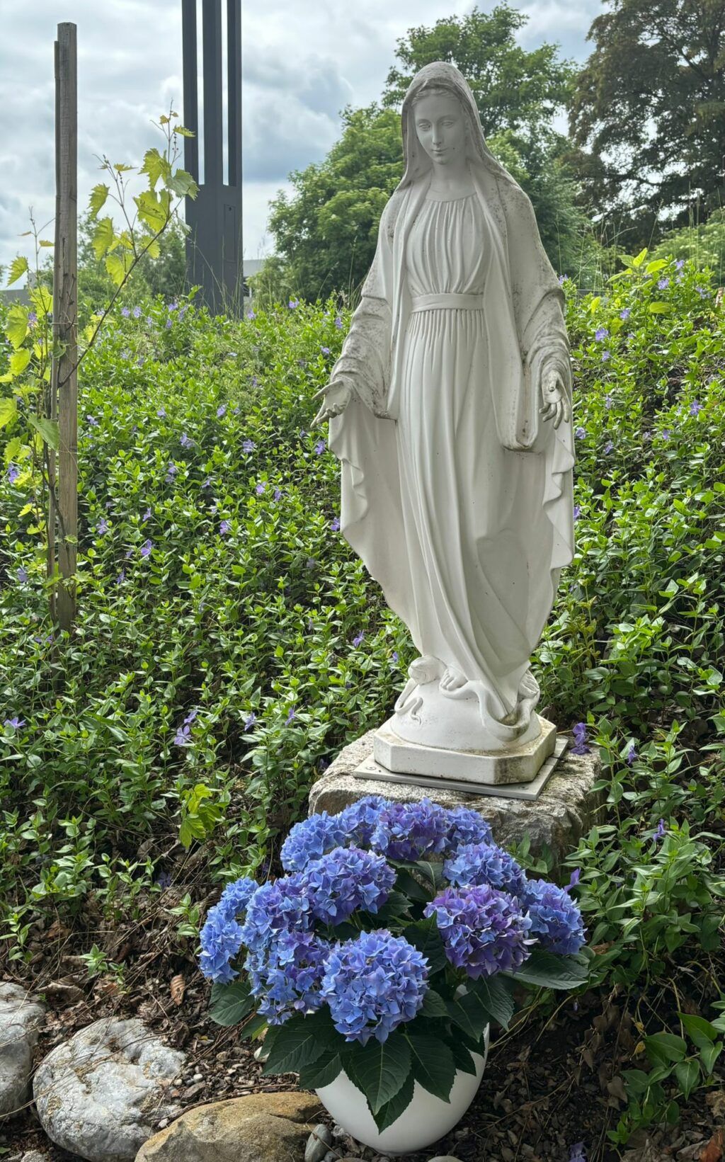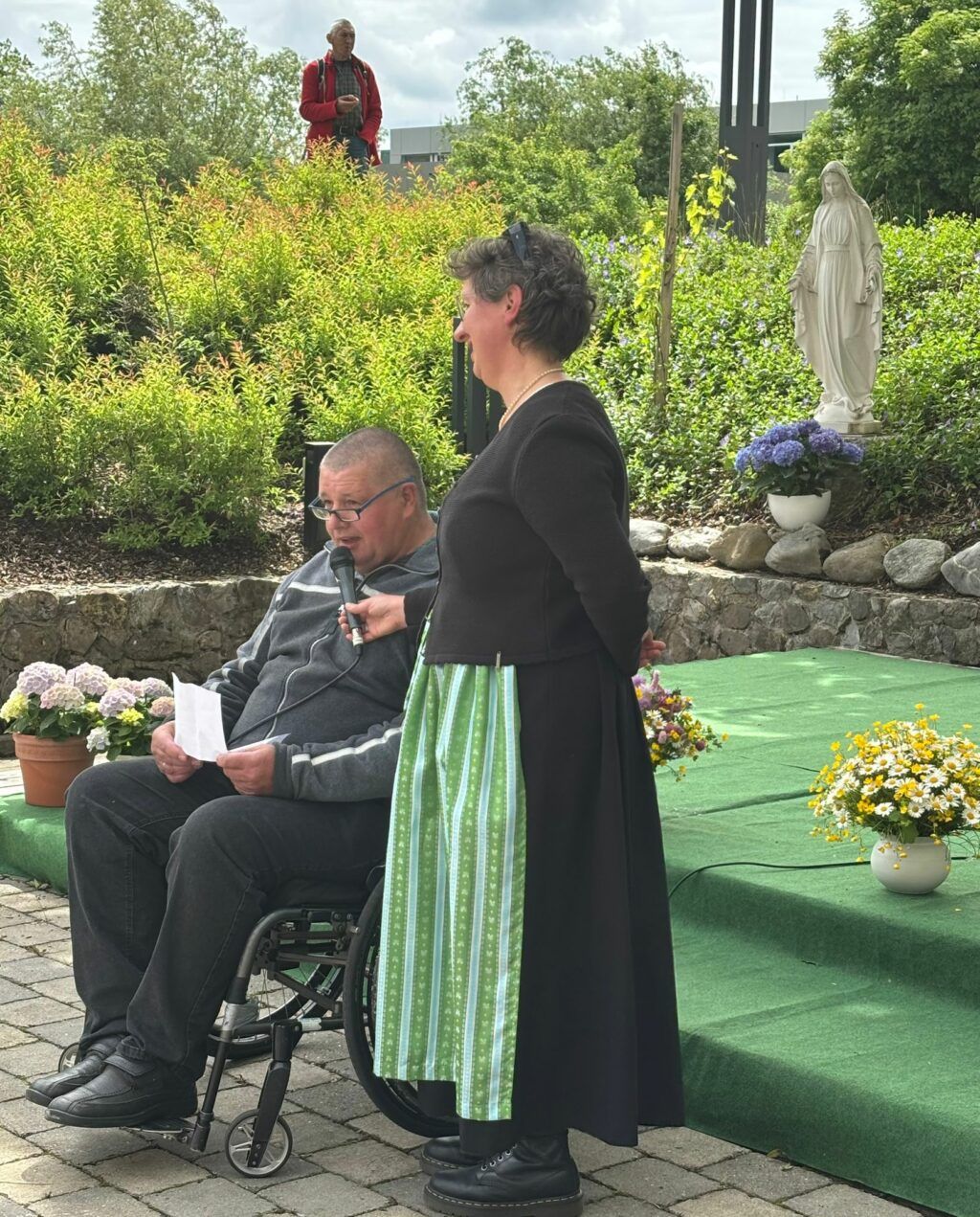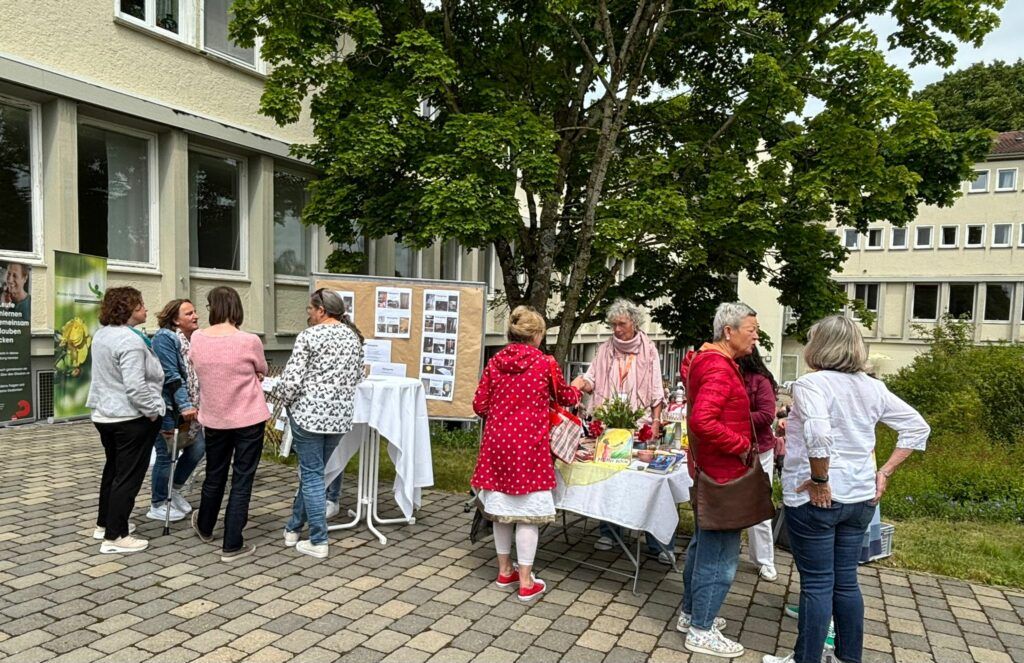 Nach der Hl. Messe war eine kleine Bitt-Prozession zur Kapelle, wo auch der Segen erteilt wurde. Danach gab es ein leckeres (auch vegetarisches) Mittagessen, später Kaffee und Kuchen. Bei den kulinarischen Köstlichkeiten verweilten viele an diesem sonnigen Nachmittag, es gab gute Gespräche, manche lernten sich kennen, die sich bisher nur von weitem oder in der Kapelle gesehen hatten. Ansprechend waren die Info-Stände gestaltet, wo „Zeit mit Gott“, Zeit mit Menschen verbracht werden konnte. Die Zellgruppe und die Mütter-beten-Gruppe luden ein, es gab gebastelte Herzen, und an einem Holzkreuz konnte man seine Sorgen mit Zettel hinnageln. Danach gab es mit Berührung des Kreuzes einen guten Rat oder Impuls zu seinen privaten Themen und Anliegen.
