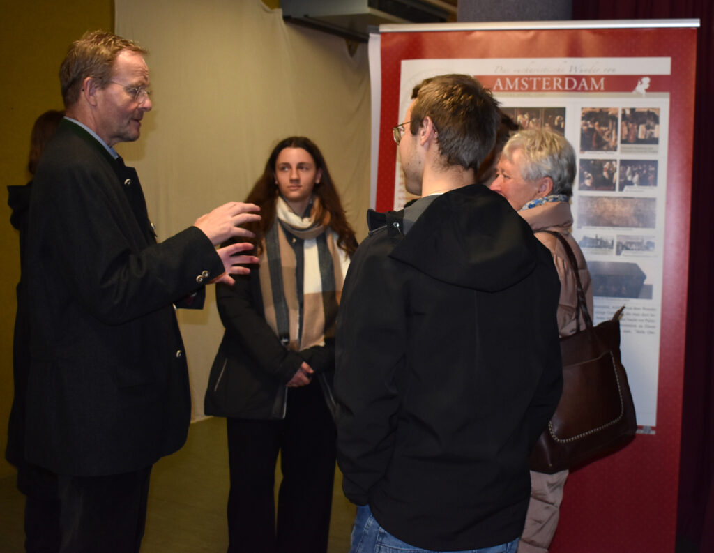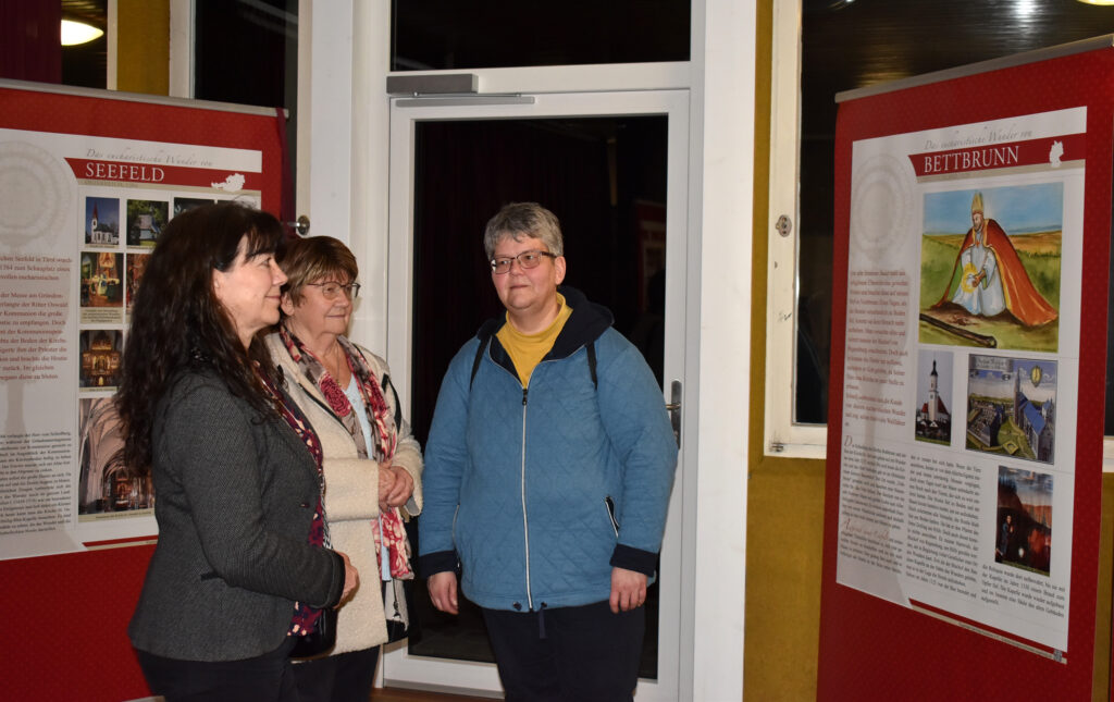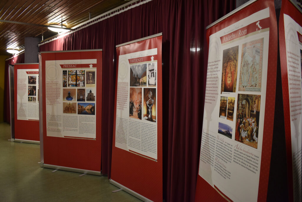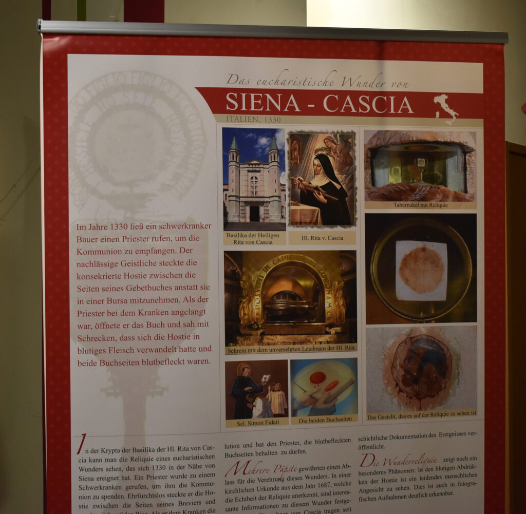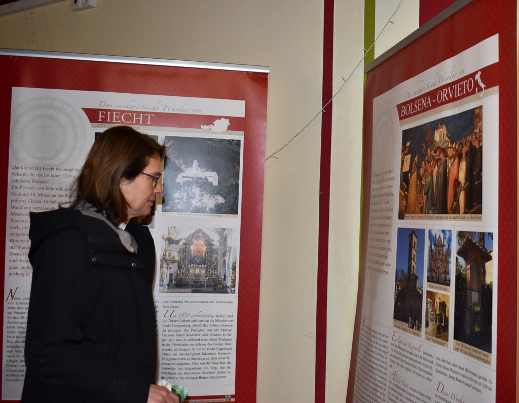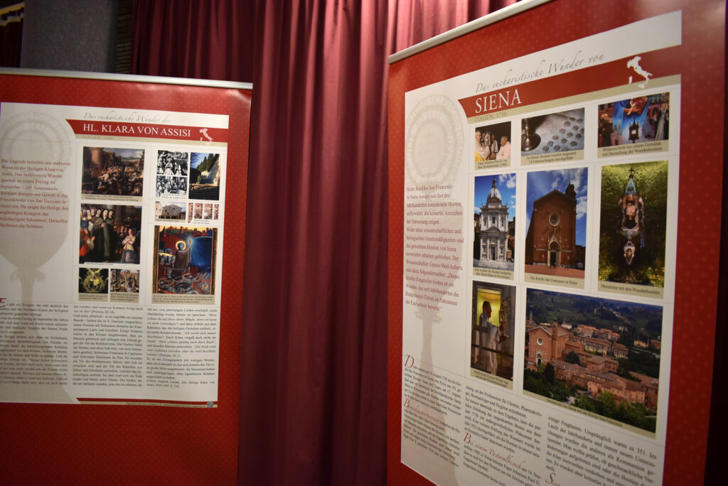 Die Ausstellung zeigt großformatige Banner mit eindrucksvollen Bildern und erklärenden Texten zu Eucharistischen Wundern. Das sind Ereignisse, bei denen sich während der Heiligen Messe Hostien in blutendes Fleisch oder der Wein im Kelch in Blut verwandelt haben sollen. Auch Berichte über Stigmata, wie sie etwa der heilige Pater Pio trug, finden hier Raum. Bei der Eröffnung führte Pater Hubertus eine Gruppe Interessierter durch die Ausstellung, und gab spannende Einblicke in die Hintergründe der gezeigten Phänomene.