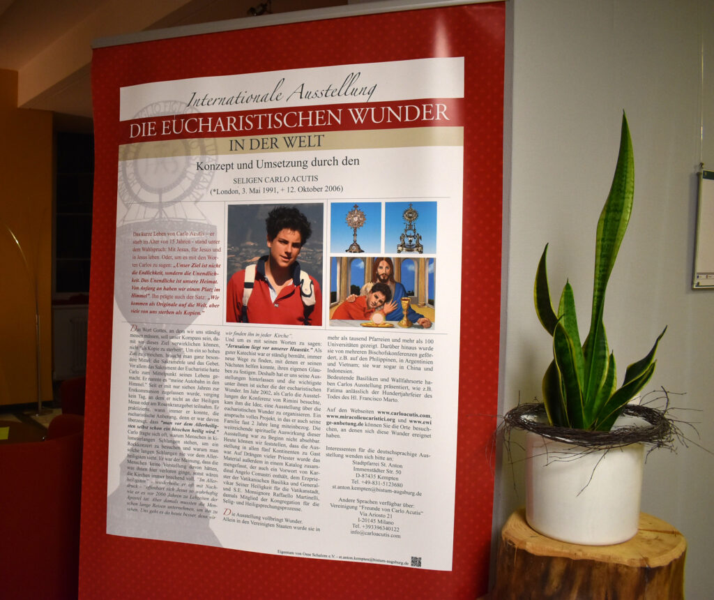 Carlo Acutis starb 2006 im Alter von nur 15 Jahren. Trotz seines kurzen Lebens hinterließ der italienische Jugendliche ein beeindruckendes Vermächtnis. Mit großer Begeisterung sammelte und dokumentierte er Eucharistische Wunder aus aller Welt und machte sie über das Internet zugänglich – ein Projekt, das ihm bis heute den Beinamen „Cyber-Apostel der Eucharistie“ eingebracht hat. Auf Grundlage dieser Sammlung entstanden internationale Wanderausstellungen, die nun auch in Leutkirch Station machen.