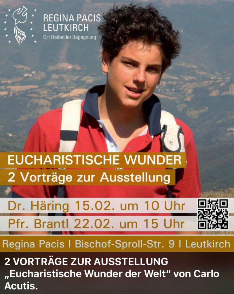 Ein besonderer Ort ist Regina Pacis auch deshalb, weil sich hier seit einigen Jahren eine Körperreliquie des heiligen Carlo Acutis befindet. Diese erhielt der Buchautor Thomas Alber direkt von der Familie Acutis in Mailand, als er für sein Buch über Carlo recherchierte. Mit der Reliquie wird regelmäßig der Segen gespendet. Carlo Acutis ist in Assisi beigesetzt. Das Buch von Thomas Alber gibt es im Buchhandel oder beim FE-Verlag in Immenried. Ein besonderer Höhepunkt während der Ausstellung ist ein Vortrag über Carlo Acutis am Sonntag, 22. Februar, um 15.00 Uhr im großen Saal von Regina Pacis. Referent ist Pfarrer Tobias Brantl aus Augsburg, der die Ausstellungen organisiert.