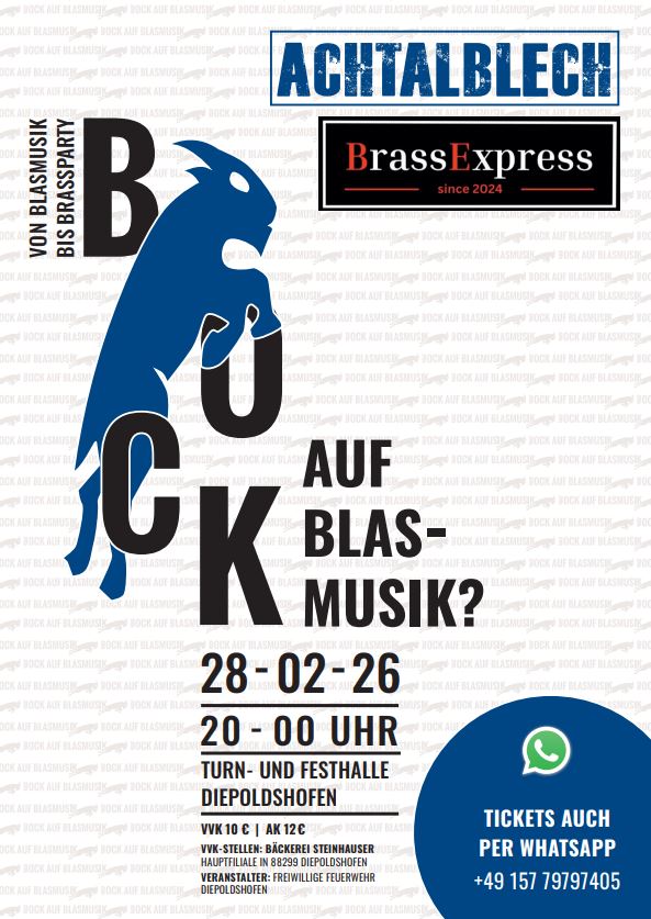 Diepoldshofen – BOCK AUF BLASMUSIK – Von Blasmusik bis Brassparty! Macht Euch bereit für einen Abend voller fetter Sounds! Erlebt das ACHTALBLECH und den BRASSRXPRESS live! Erst traditionell-gemütlich, dann absolut partytauglich. Blasmusik trifft Brass-Power, die in die Beine geht. Am 28. Februaur, 20.00 Uhr, Turn-/Festhalle Diepoldshofen. Für Stimmung, Blasmusik-Hits und kühle Getränke ist gesorgt. Veranstalter: Freiwillige Feuerwehr Diepoldshofen