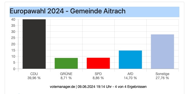Aitrach (dbsz) – Bei der Europawahl im Bereich der Gemeinde Aitrach ist die CDU mit 40 % klare Siegerin. Die AfD holte 14,7 %. Grüne und SPD liegen bei 8,7 bzw. 8,9 % nahezu gleichauf. Dieses Ergebnis wurde auf der Website der Gemeinde Aitrach um 19.14 Uhr veröffentlicht.