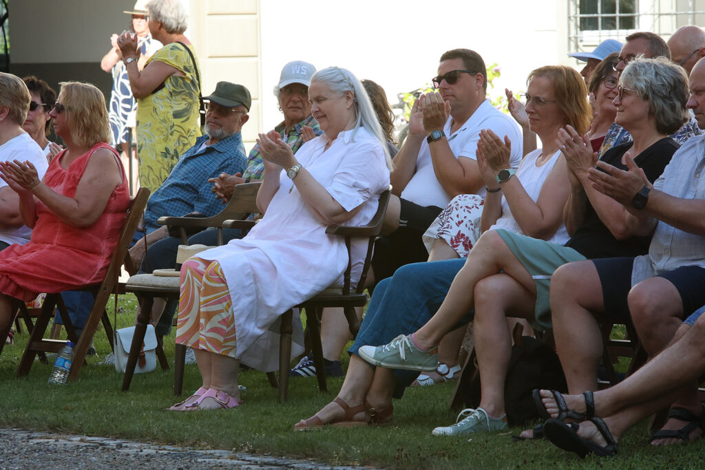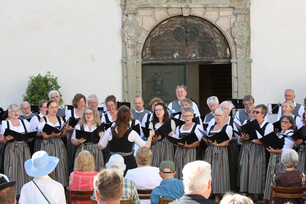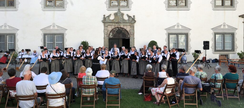 Das Konzert unter freiem Himmel, im Schatten der alten Schlossmauern, war ein voller Erfolg. Das Publikum war so zahlreich, dass die bereitgestellten Stühle und Bänke bei weitem nicht ausreichten. Einige Besucher genossen den Abend auf der Umfassung des Schlossbrunnens, was dem Konzert eine ganz besondere Atmosphäre verlieh. Der Applaus war überwältigend und die Musikerinnen und Musiker freuten sich über viele positive Gespräche und Rückmeldungen. Christine Schmelzenbach, Vorsitzende des AlphornCHORs, und Günther Eisele, Vorsitzender der Chorgemeinschaft, begrüßten die Gäste, insbesondere I.K.H. Mathilde Fürstin von Waldburg zu Zeil und Trauchburg, die Gastgeberin.
