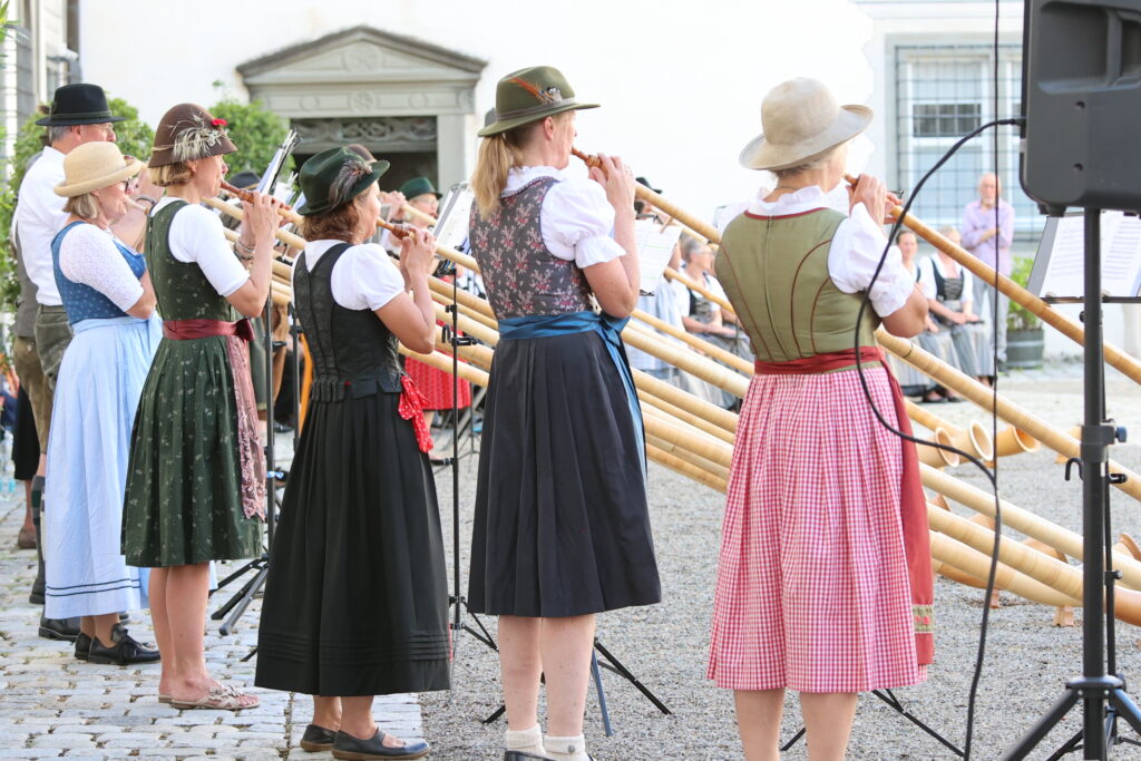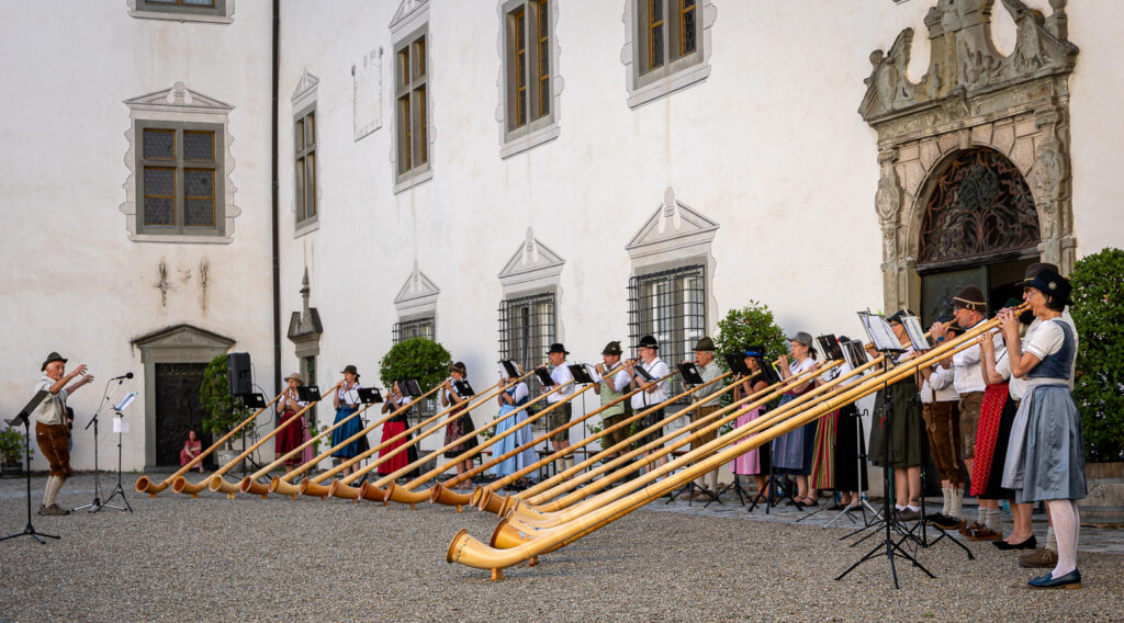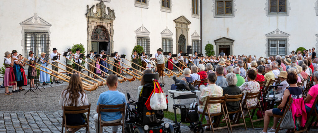 Die Alphörner erklingen im Innenhof. Foto: Sebastian Just