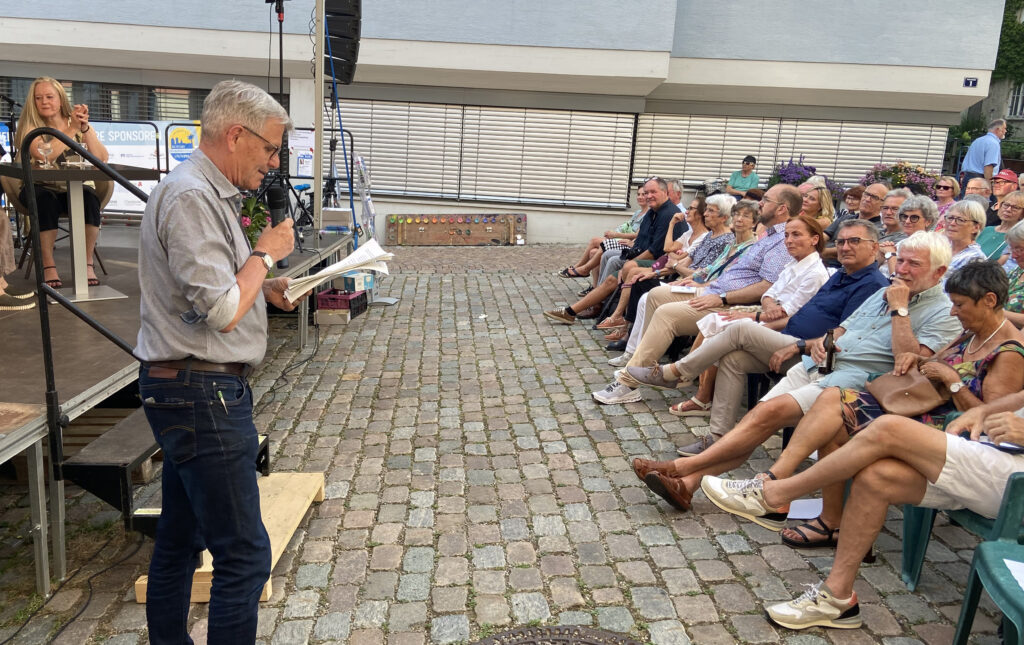 Leutkirch – Über 200 Leute. Sie versammelten sich am Montagabend, 12. August, ab 18.00 Uhr, um dort ab 19.00 Uhr beim Talk im Bock (TiB) dabei zu sein. Und zwar beim insgesamt 222. TiB. Das Publikum spendete dabei 1435 Euro für den „mobilen Malraum für geflüchtete Kinder”.