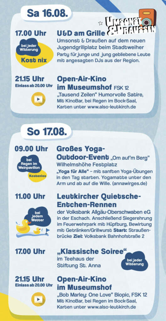 Samstag, 16. August: Umsonst & Draußen mit angesagten DJs aus der Region (Plakat hier im “Leutkircher” unter “Downloads”)