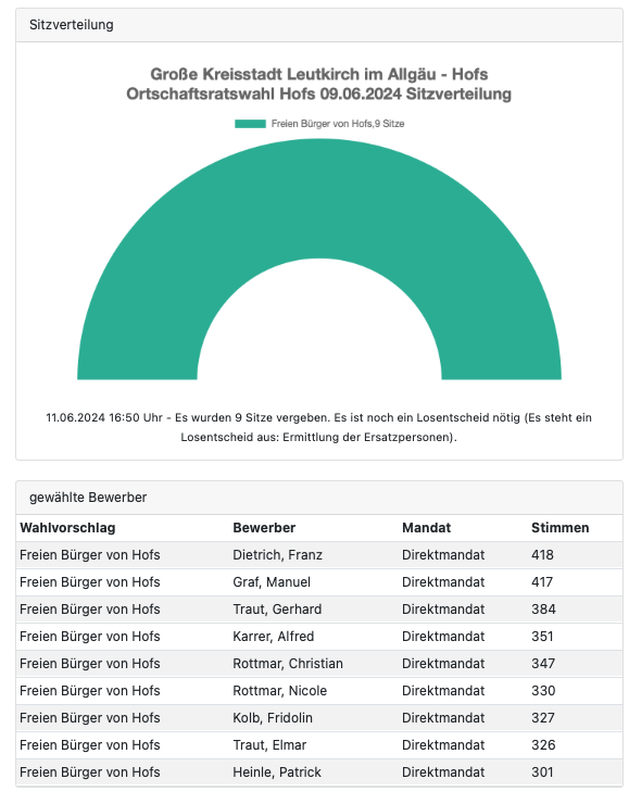 Hofs (rei) – Neun Mitglieder hat der Ortschaftsrat Hofs. Stimmenkönig ist Ortsvorsteher Franz Dietrich; auf ihn entfielen 418 Wählervoten. Auf Platz zwei rangiert Manuel Graf (417 Stimmen). Nachstehend das Ergebnis der Ortschaftsratswahl von Hofs, entnommen der Webseite der Stadt Leutkirch:
