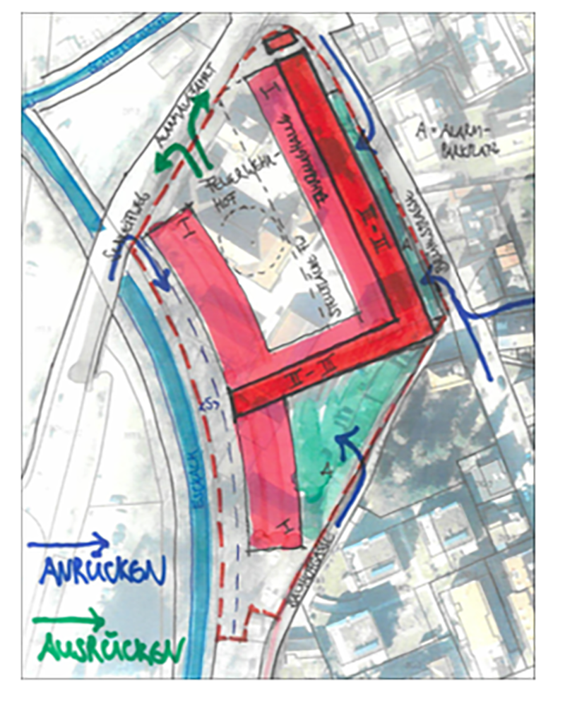 Das Bauhofareal zwischen Eschach, Bauhofgasse (rechts), Brühlstraße (oben) und Schleifweg (links). Die grünen Pfeile bezeichnen die Ausrück-Richtung bei Alarmierung (via Schleifweg), die blauen Pfeile das Einfahren vom Einsatz (via Bauhofgasse und Brühlstraße).