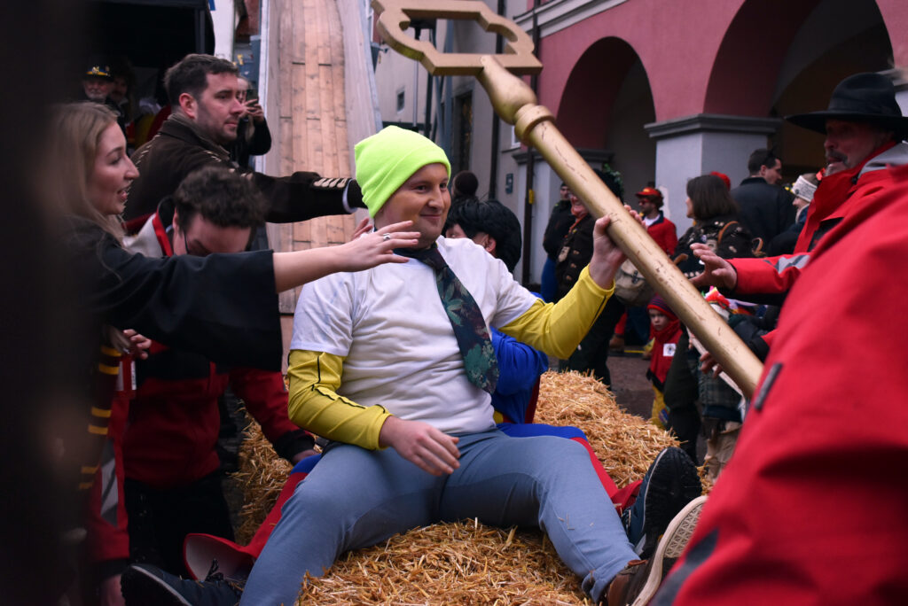 Leutkirch (rei) – Am Nachmittag des Gumpigen: Narren rotten sich vor dem Rathaus zusammen, ganz Mutige entern die Trutzburg von Hans-Jörg H. und seinen Getreuen über den Rathaus-Balkon. Rasch machen die Narren im Beamtentempel tabula rasa und entfernen die Bürokraten aus ihren Sesseln. Nach alter Sitte wird das Personal via Rutsche expediert. Doch, so gnädig sind die neuen Machthaber schon, die Griffelspitzer fallen weich. Die seitherige Nummer eins – das wurde allenthalben mit Respekt anerkannt – ist ein weitblickender Kopf: Vorsorglich hatte sich Hans-Jörg der Verflossene eine weiße Fahne besorgt. Thomas B., der nun das Sagen im Städtle hat, sah das Kapitulationstextil mit Wohlgefallen. Und freute sich an dem riesigen Rathaus-Schlüssel als Trophäe und Symbol der neuen Macht. Unsere Reporterin Carmen Notz hat den denkwürdigen Moment des Regierungswechsels mit der Kamera eingefangen:
